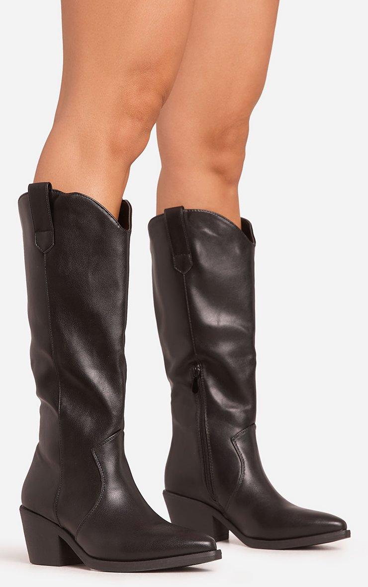Traveller Pointed Toe Mid Calf Western Cowboy Boot In Black Faux Leather