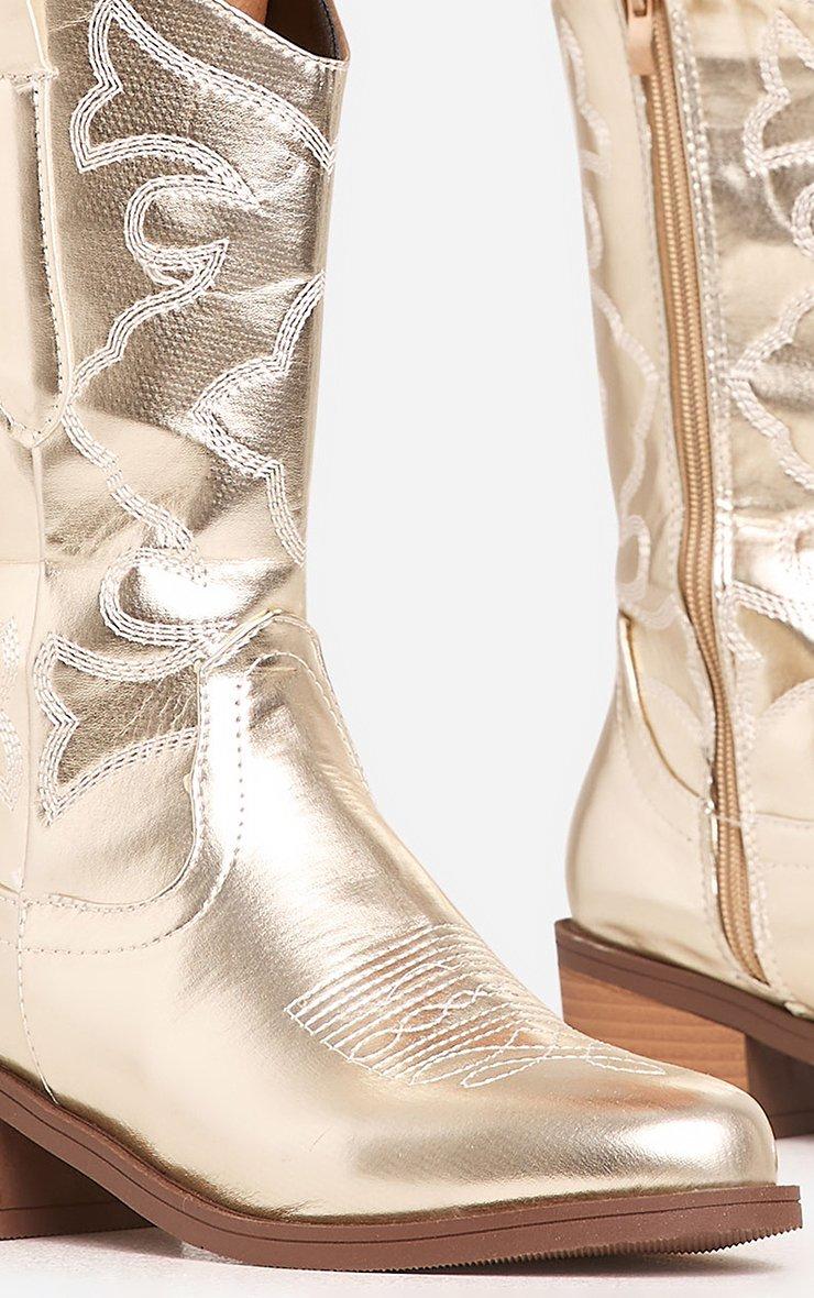 Hit refresh on your new season wardrobe with these essential boots doll. Featuring a gold faux leather material, with embroidered detailing, a pointed toe, mid calf length and a western cowboy boot design.
