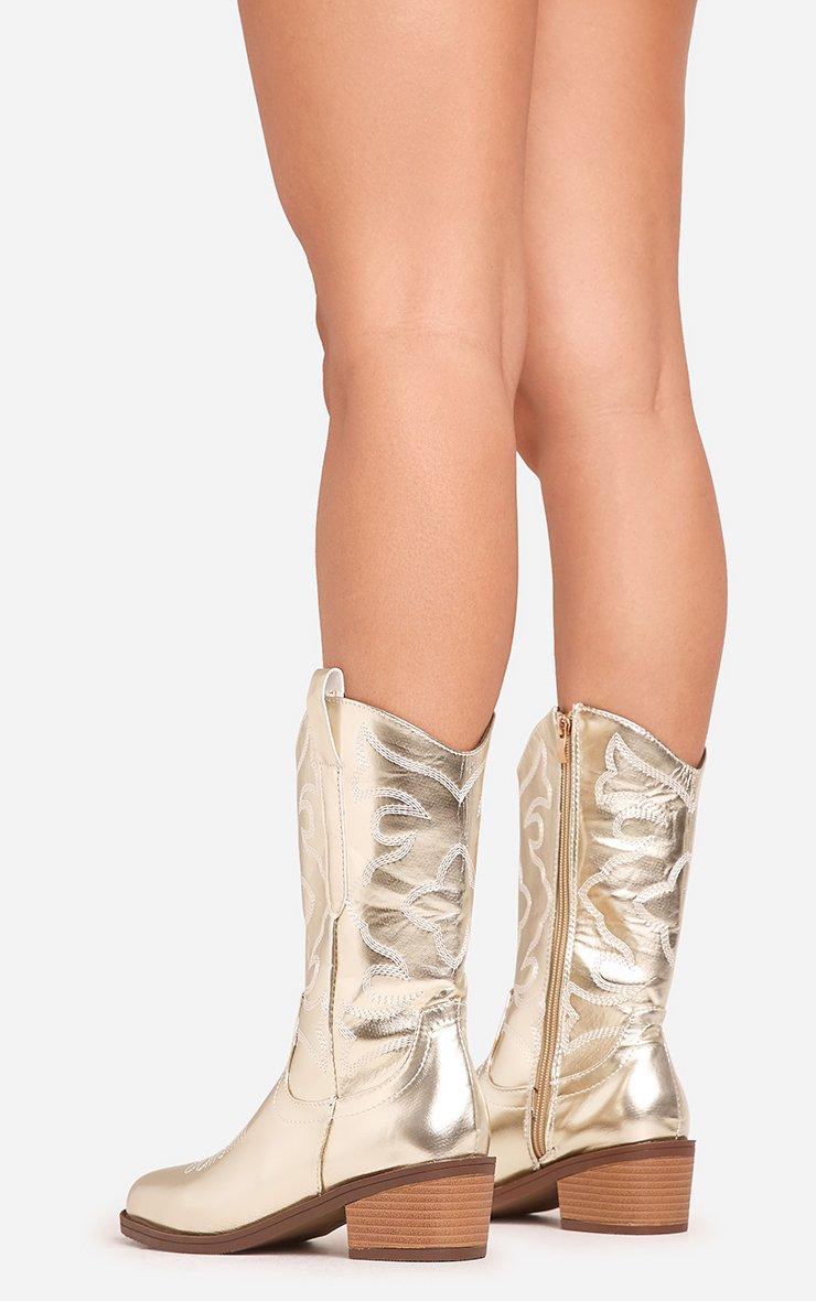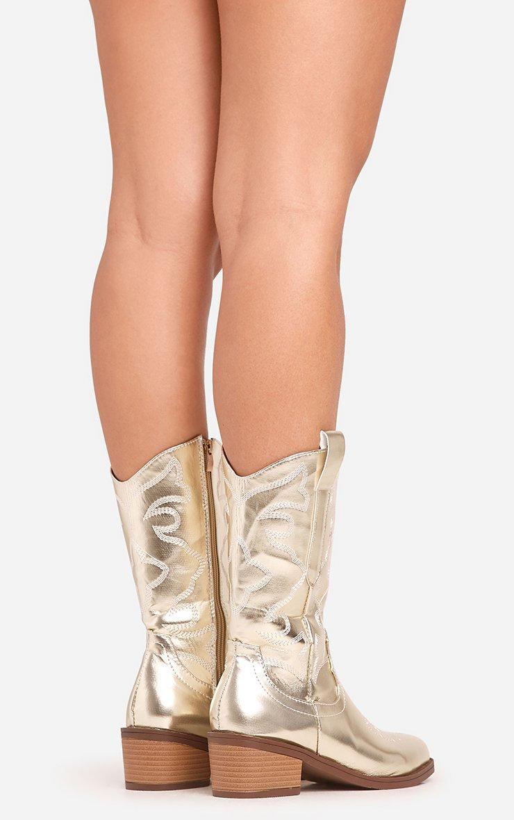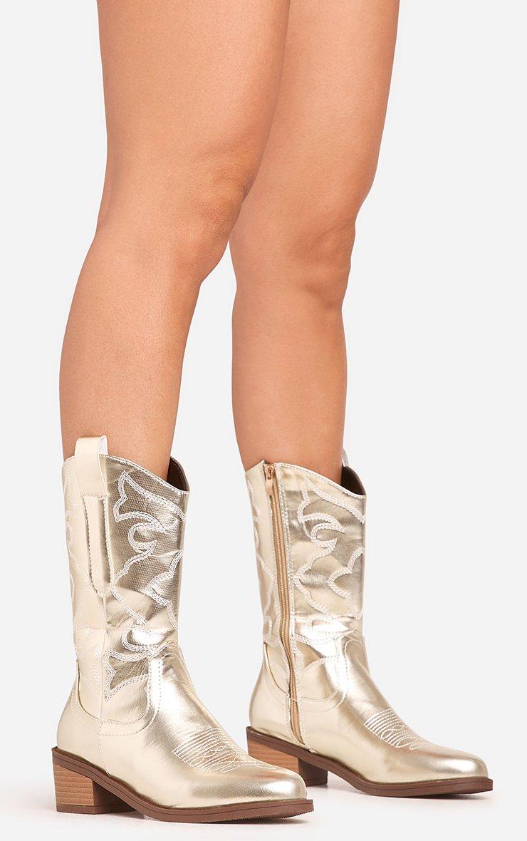 Newly Embroidered Detail Pointed Toe Mid Calf Western Cowboy Boot In Gold Faux Leather