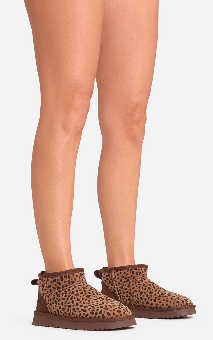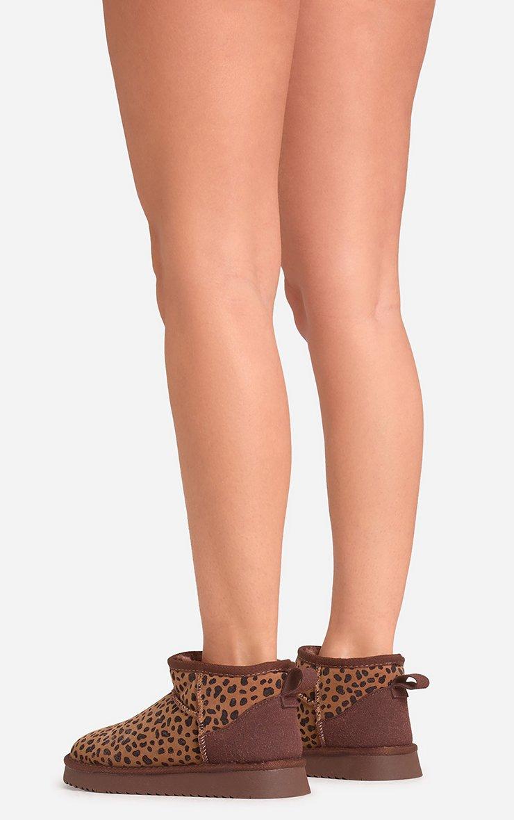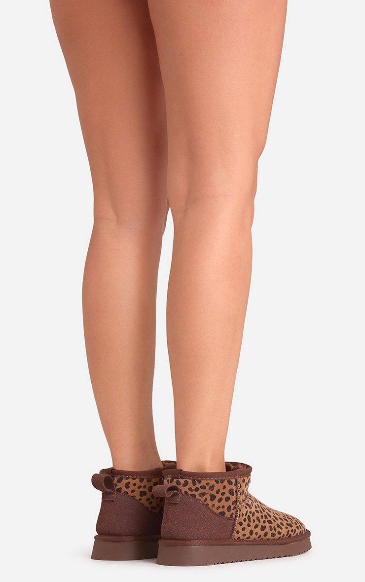 Ultra Mini Ankle Length Faux Fur Lining Boots In Brown Leopard Print Faux Suede