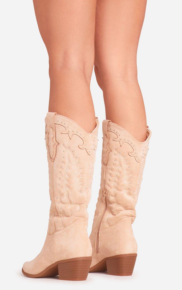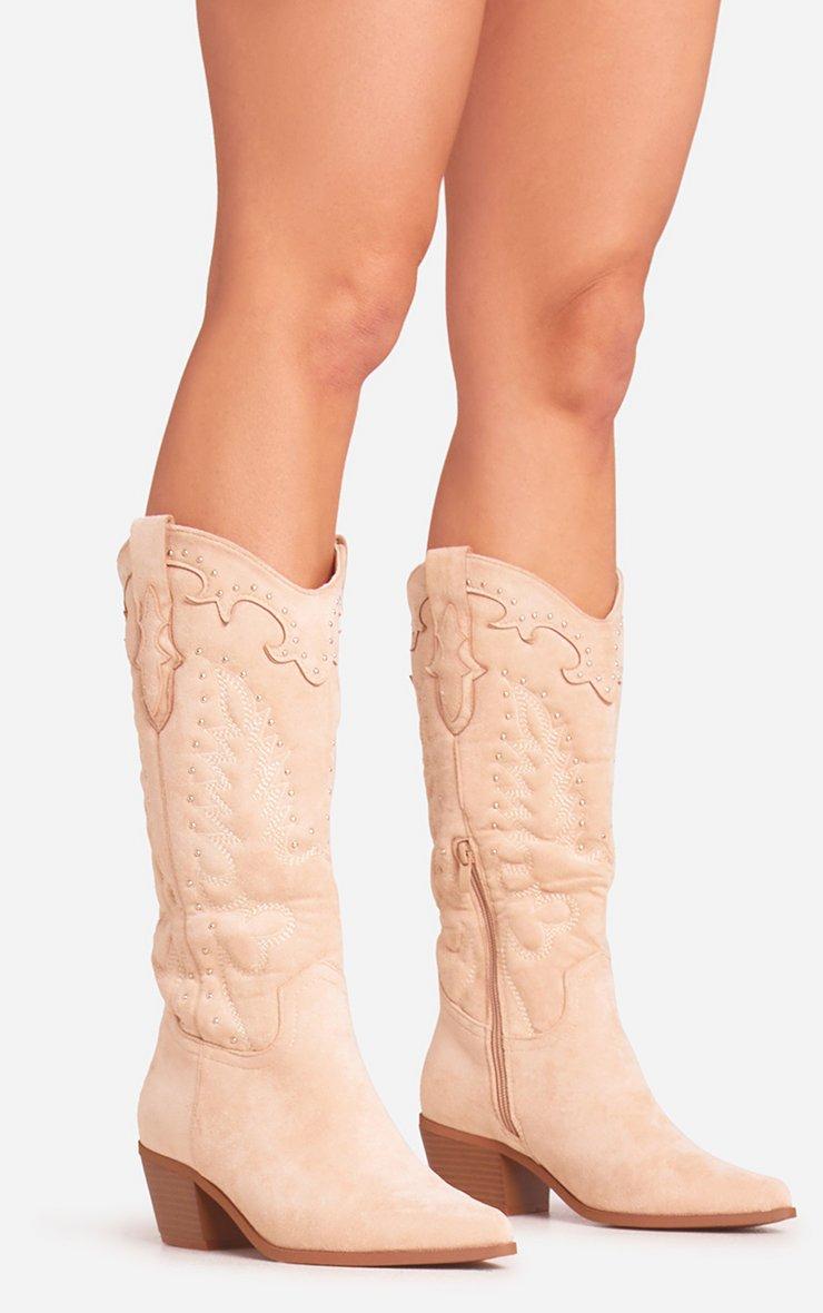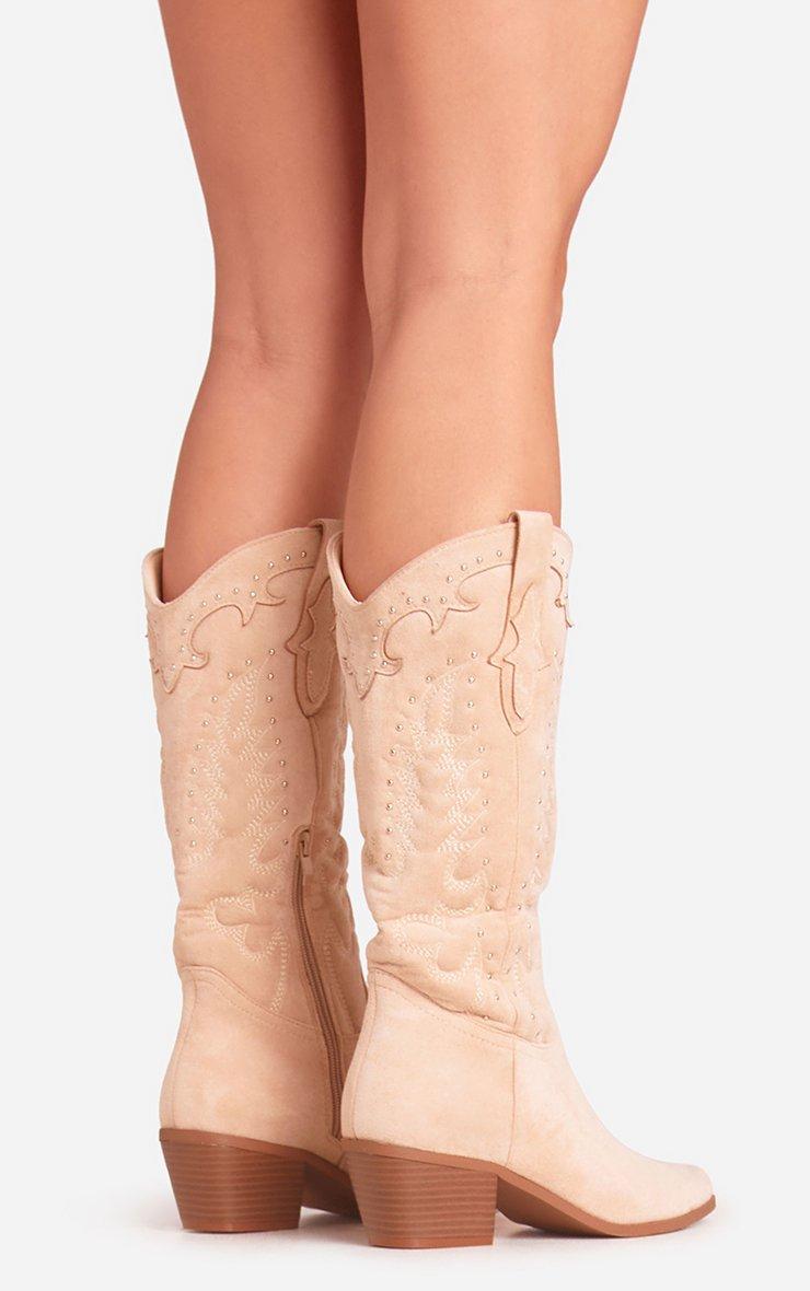 Elevate your AW wardrobe with the Woods Embroidered Detail Pointed Toe Mid Calf Western Cowboy Boot in taupe faux suede. These nude faux suede western boots are your new-season obsession with their intricate embroidered details, mid-calf fit and sleek pointed toe. Pair these cowboy boots with your fave mini skirt and tights for a fierce fall fit!