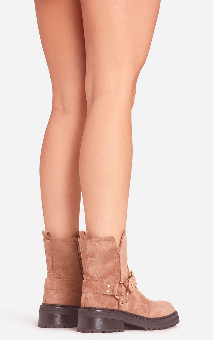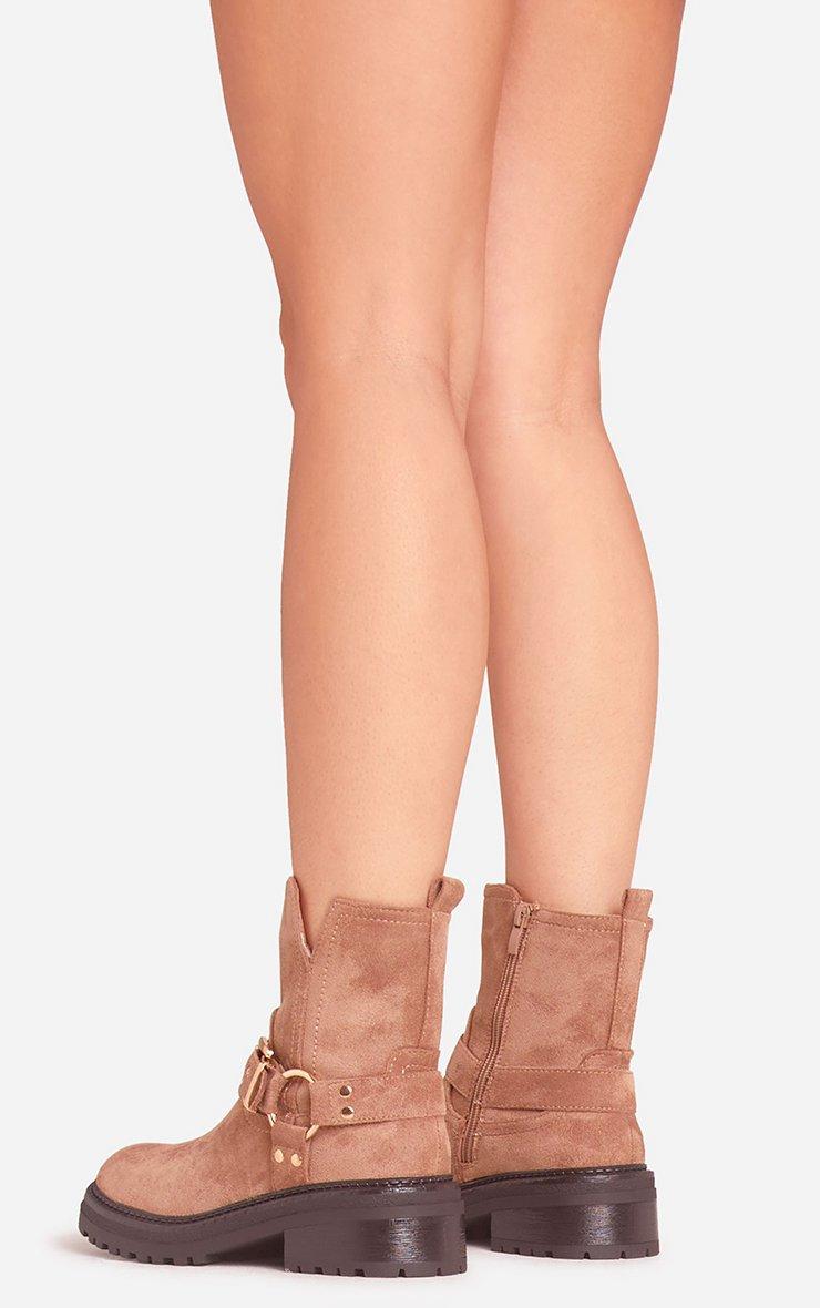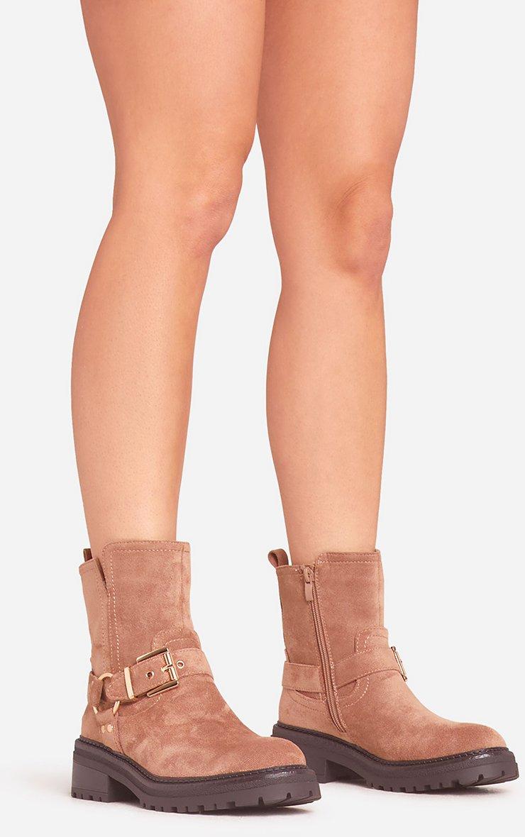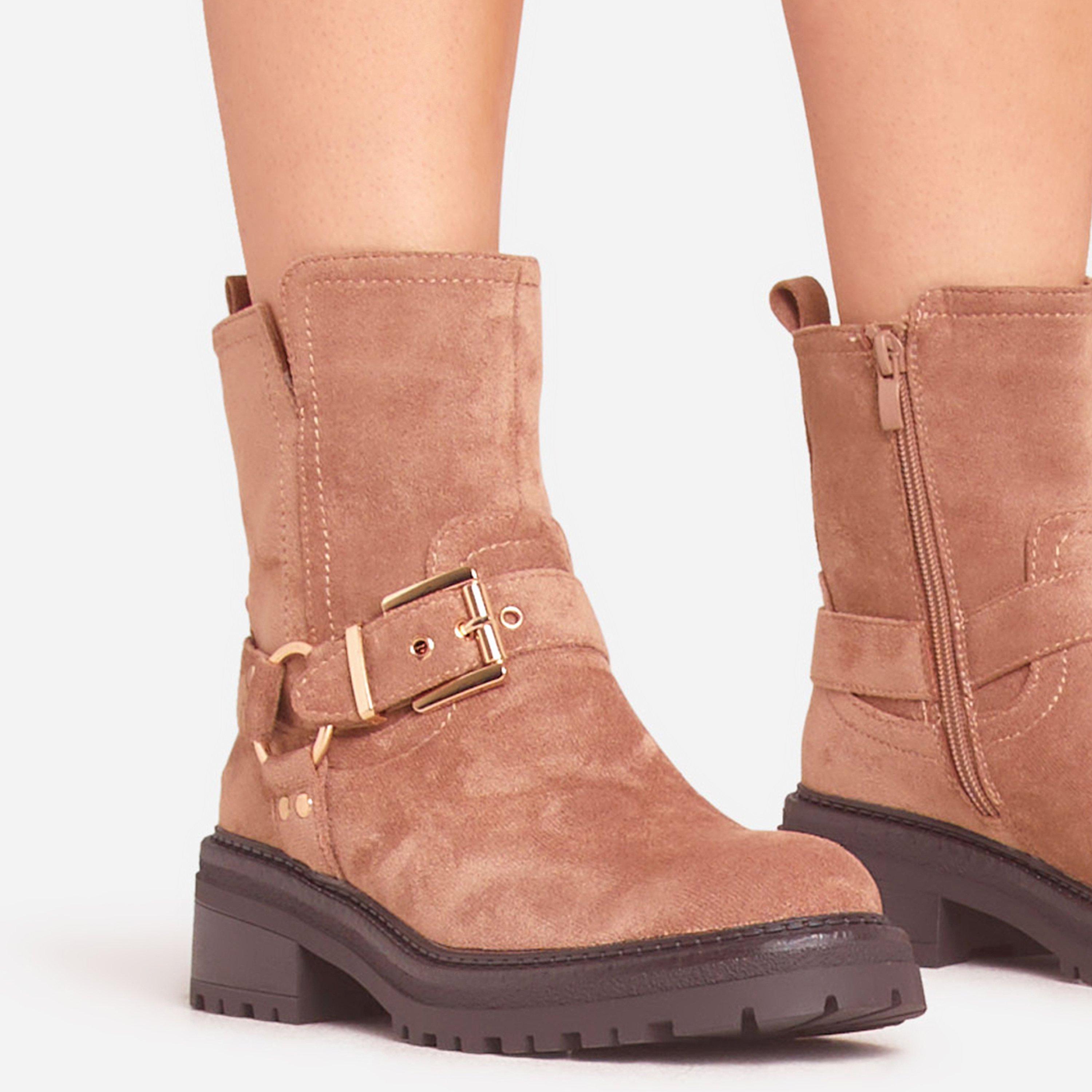 Edward Buckle Detail Chunky Sole Ankle Biker Boot In Taupe Faux Suede