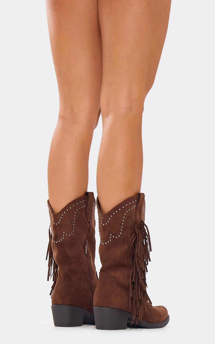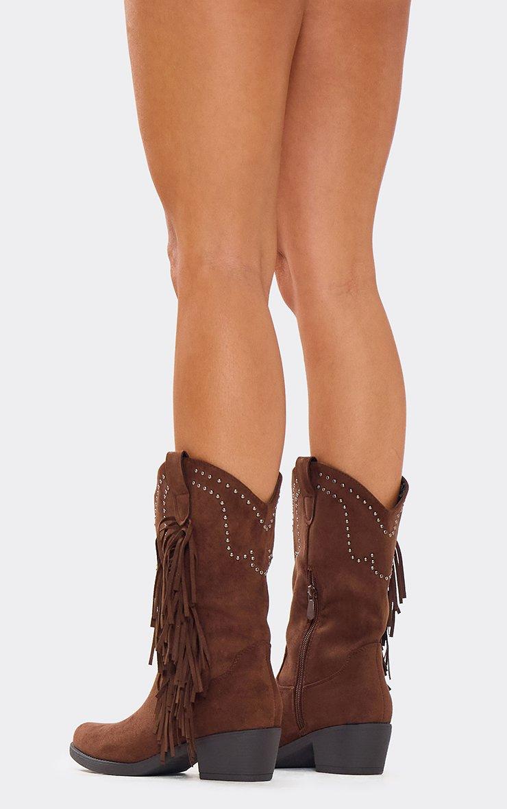 Coraline Diamante Tassel Detail Mid Calf Western Cowboy Boot In Brown Faux Suede