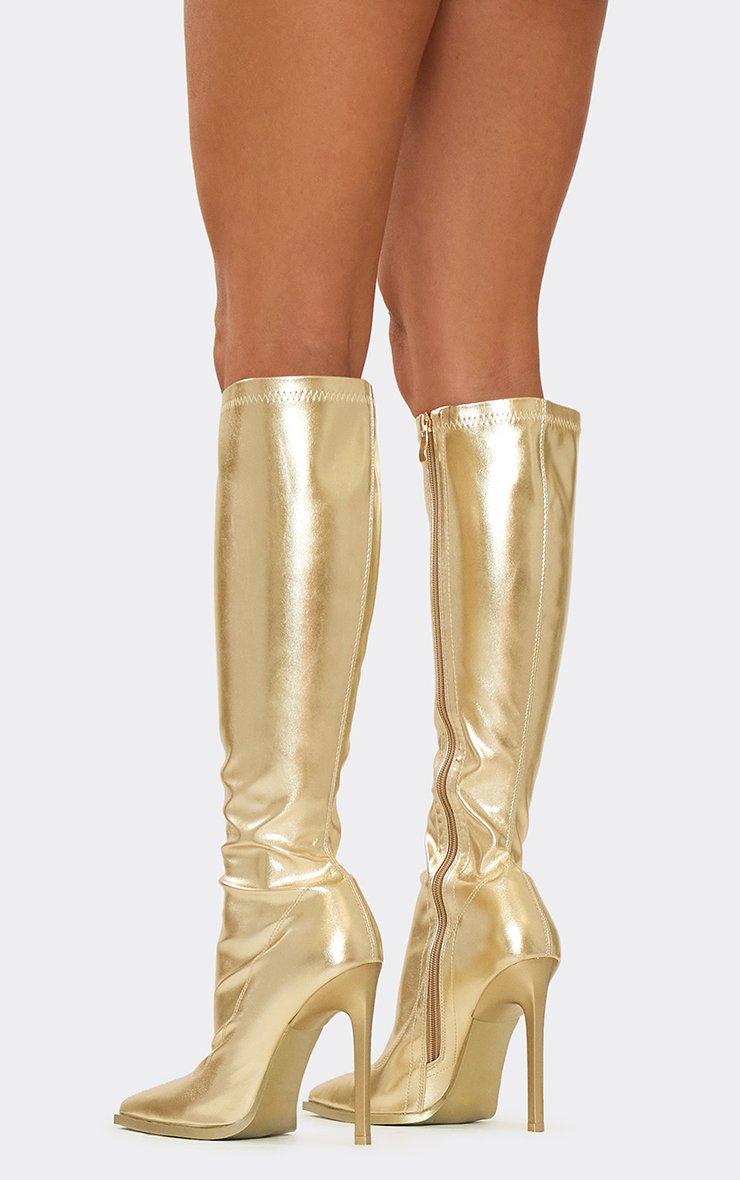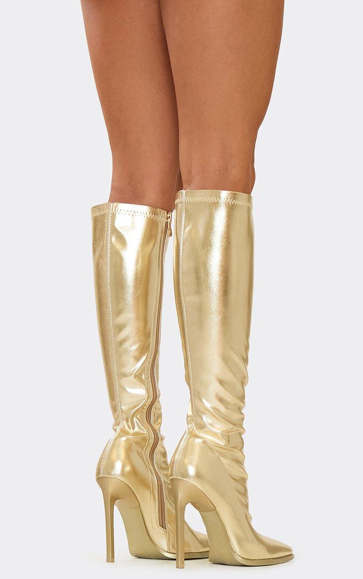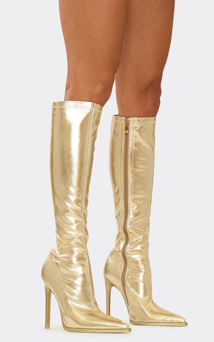 Million Pointed Toe Stiletto Heel Knee High Long Boot In Gold Faux Leather