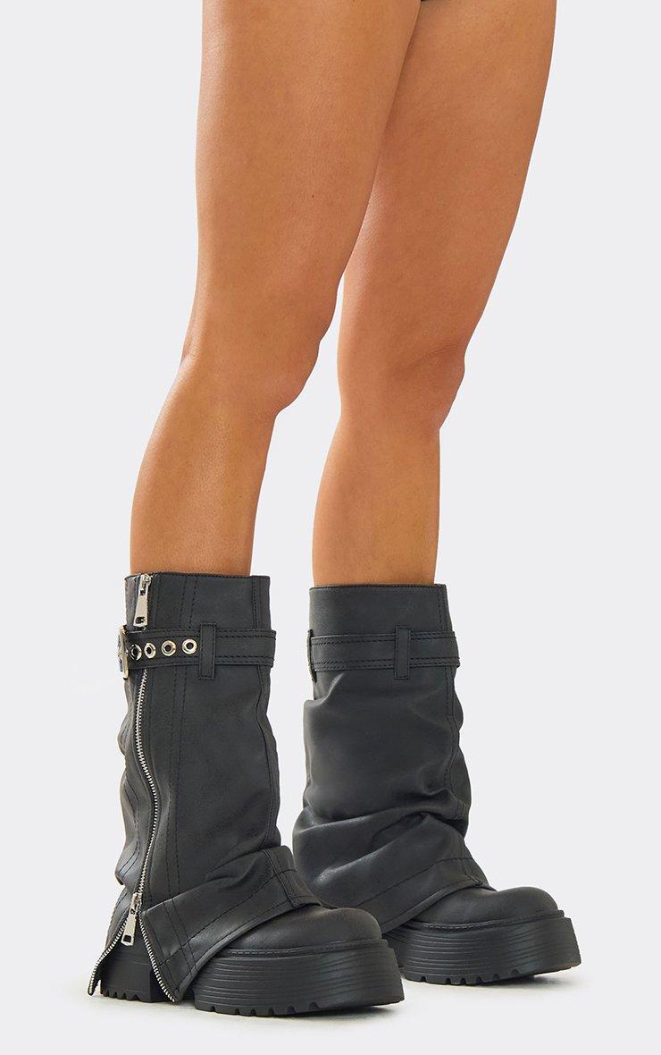 Poster Side Zip Split Belted Chunky Mid Calf Biker Boot In Grey Faux Leather