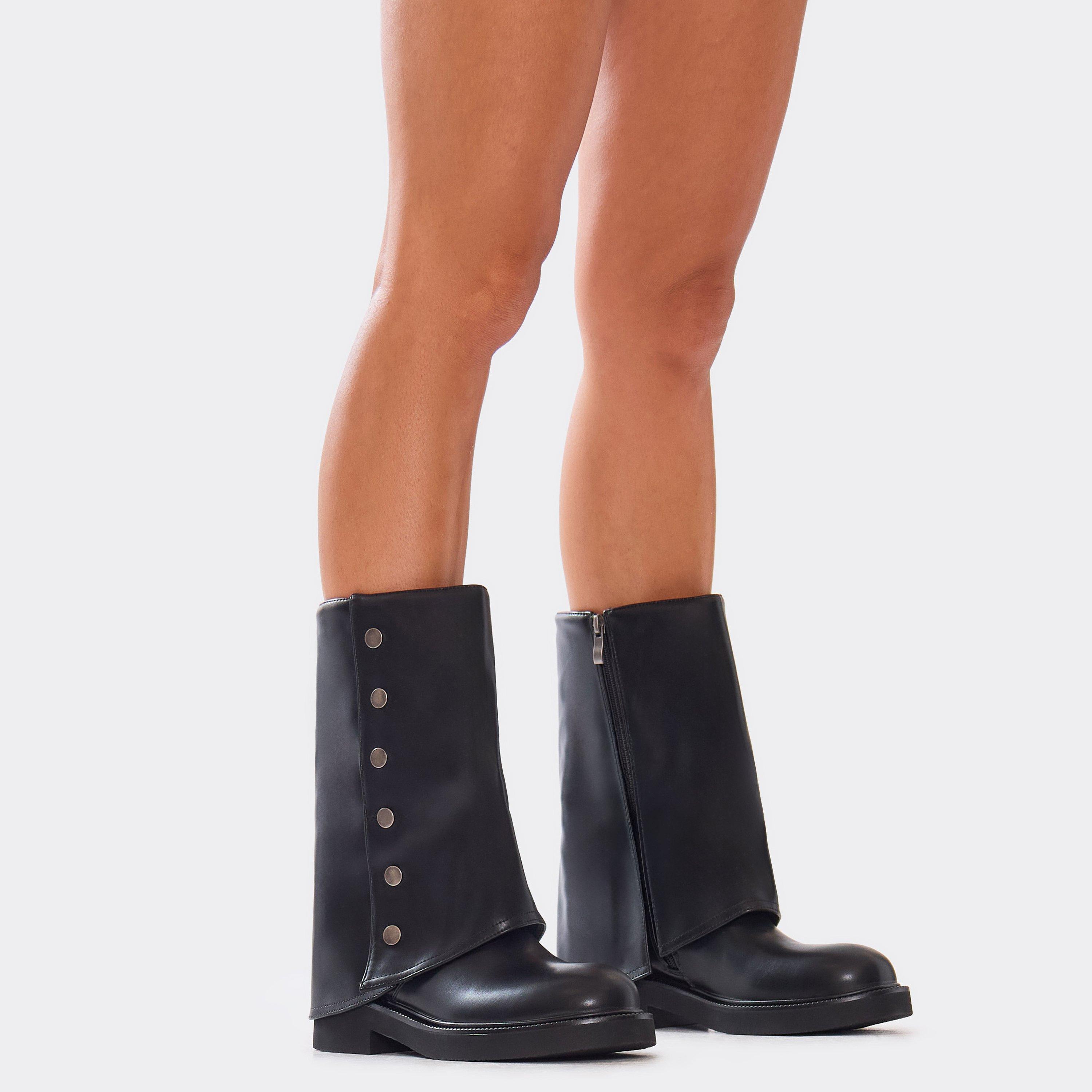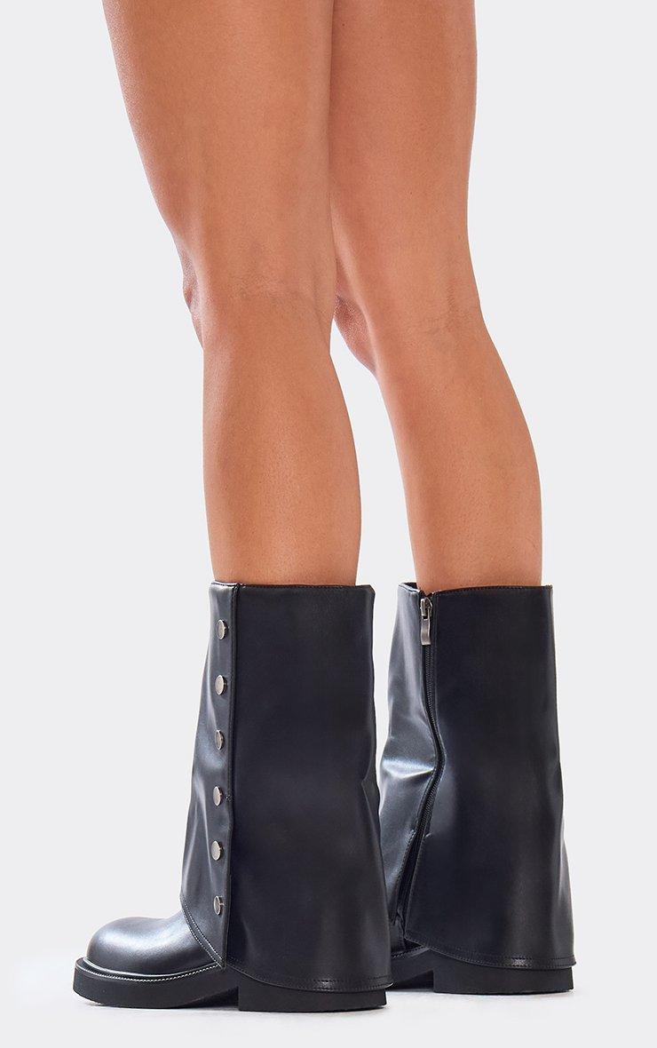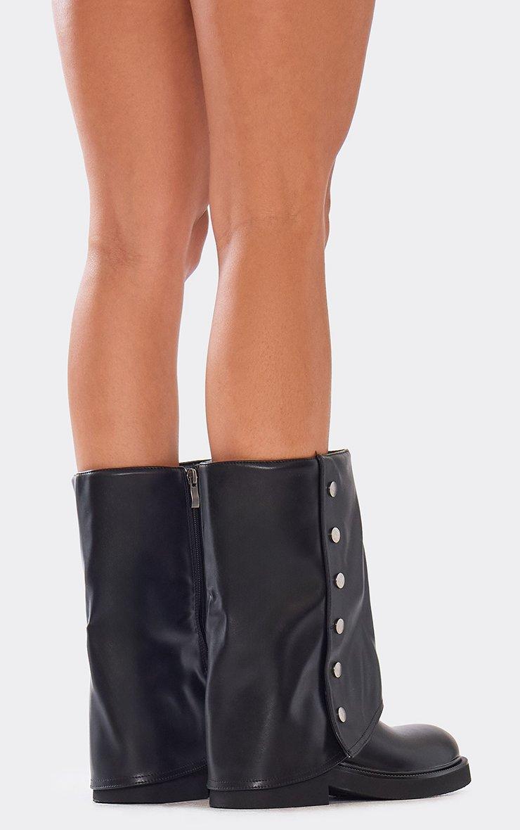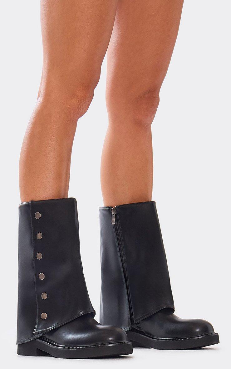 Edgy vibes, doll. Featuring a black faux leather material with layered stud and mid calf biker detailing, these boots are serving chic, bold energy for a standout look.