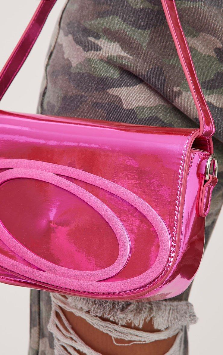 Add a pop of colour to your weekend look doll. Featuring a pink metallic patent material, with diamante detailing and a shaped shoulder bag design.