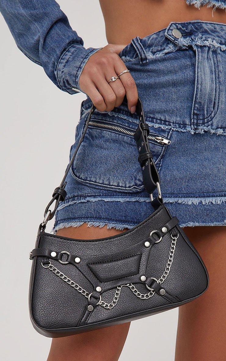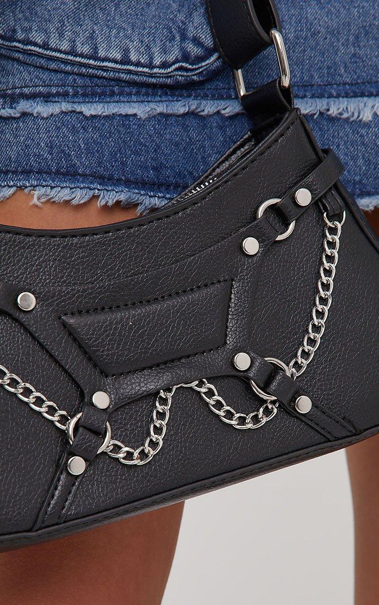 Take your look from day to night with this essential bag doll. Featuring a black faux leather material, with chain detailing and a shaped shoulder bag design.