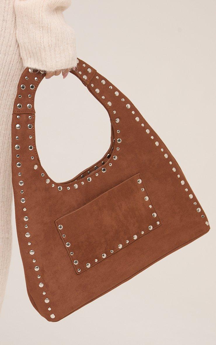 Nora Stud Detail Shaped Shoulder Bag In Brown Faux Suede