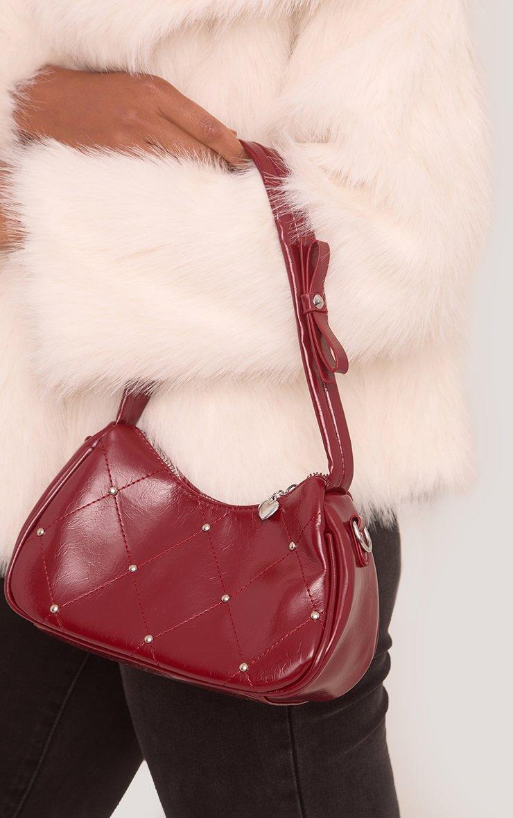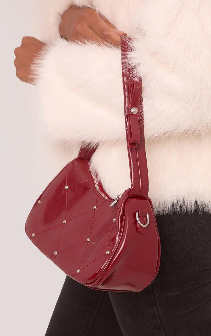 Iris Quilted Stud Detail Shaped Shoulder Bag In Burgundy Patent