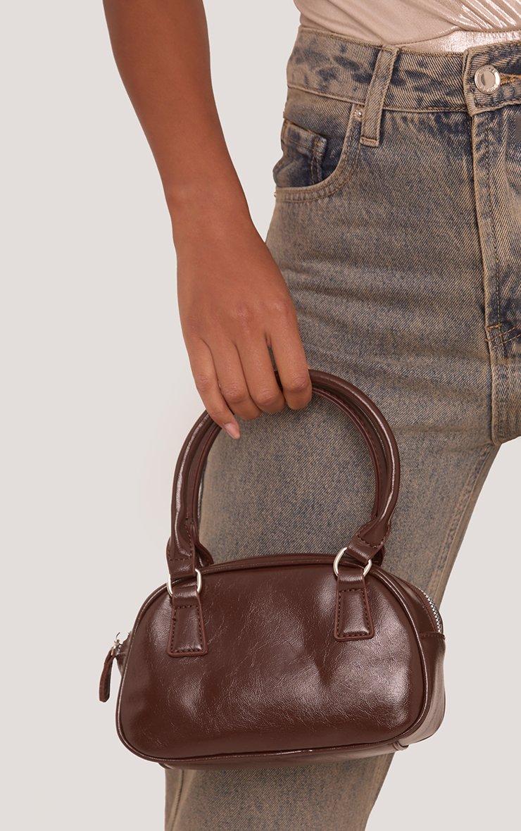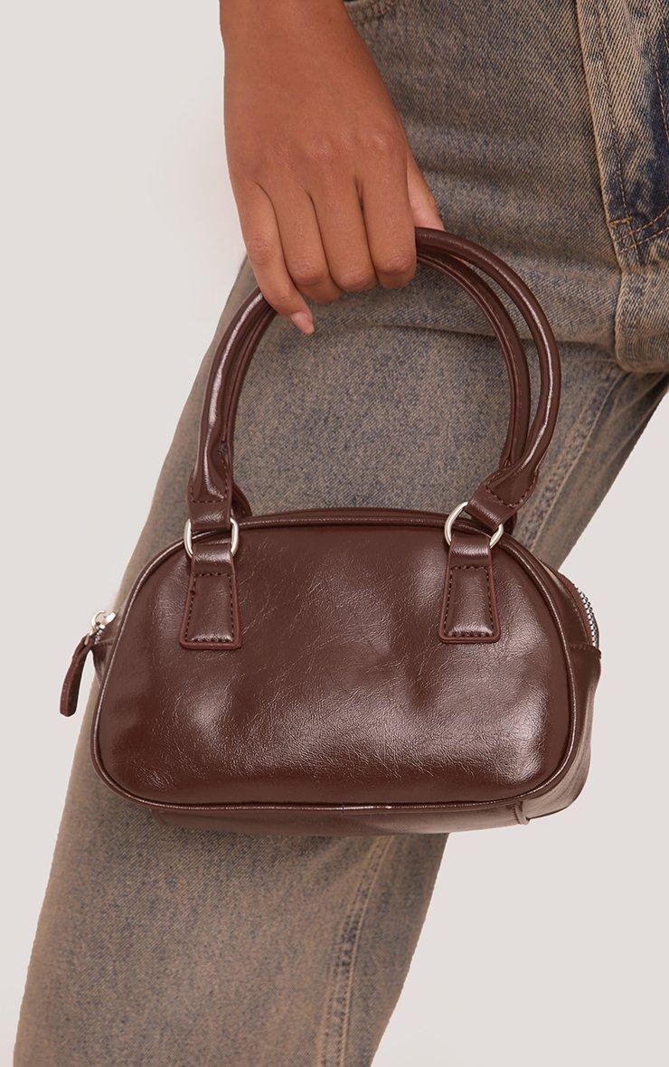 Catch all the eyes, babe. This brown patent mini grab bag is sleek, structured, and the perfect size for your essentials. Its bold shape and glossy finish bring major attitude to any outfit.