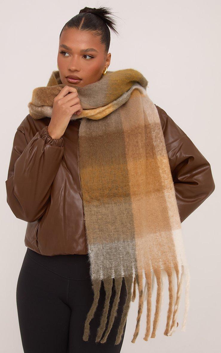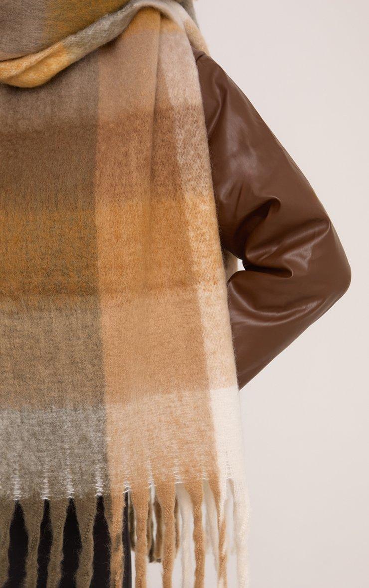 Get ready to elevate your look, doll! This fringe hem oversized scarf in brown check is the perfect blend of cozy and chic.
