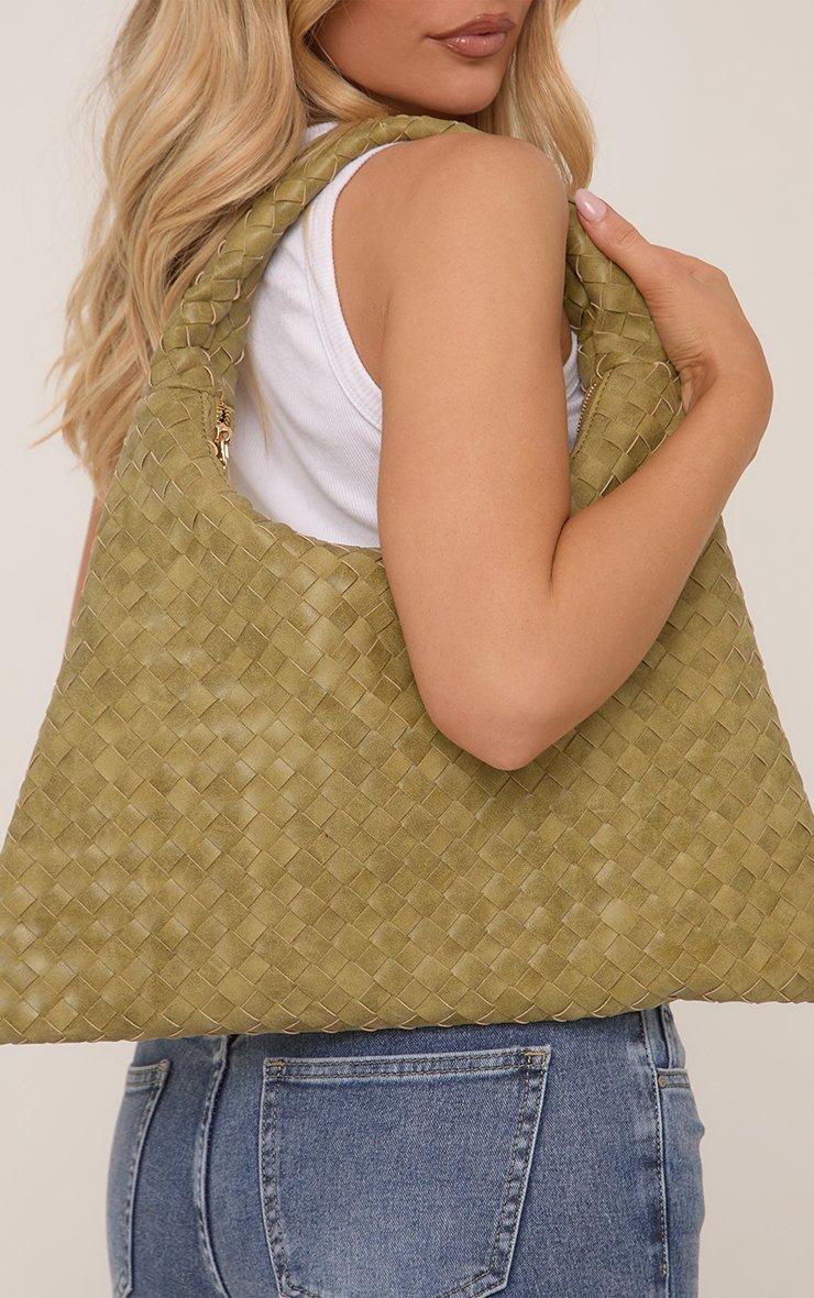 Doll, upgrade your arm candy! Featuring a green faux suede material with woven detailing, this shaped shoulder shopper bag is all about luxe vibes and standout style.