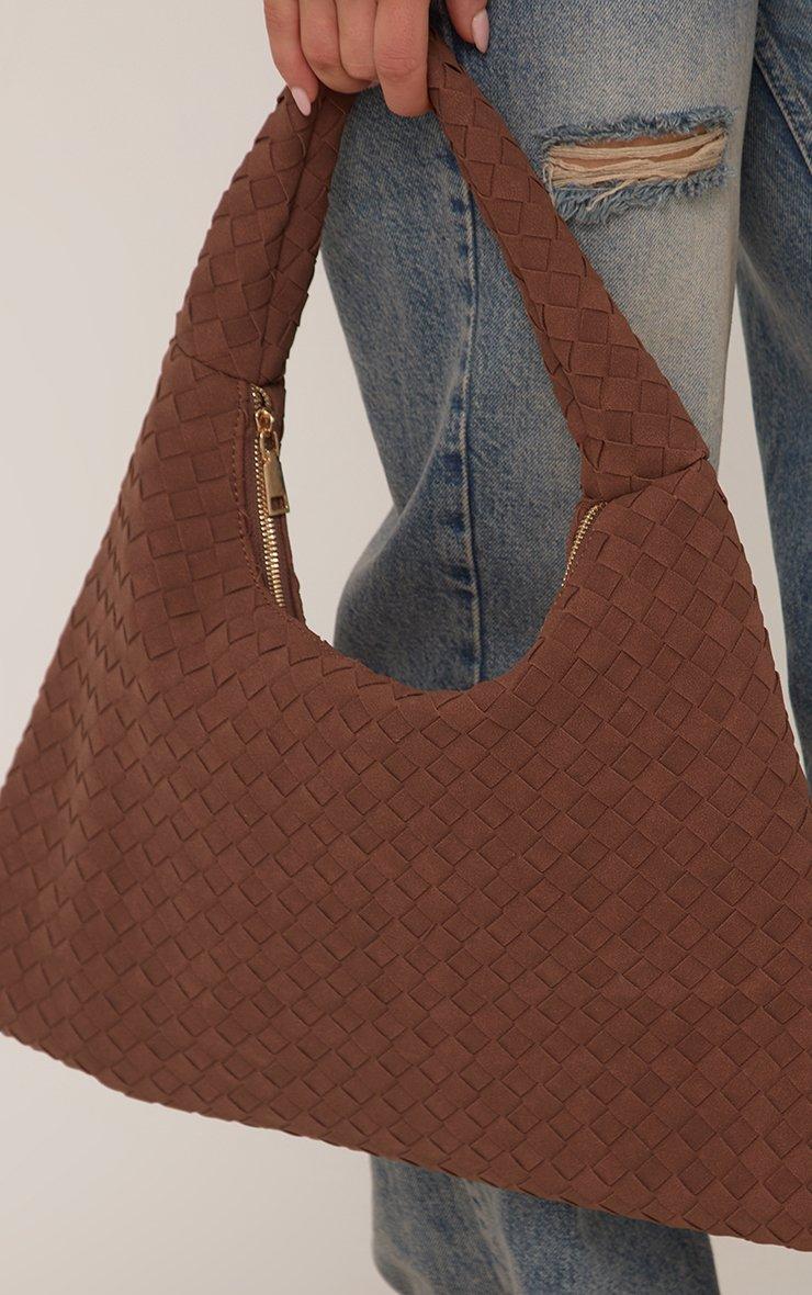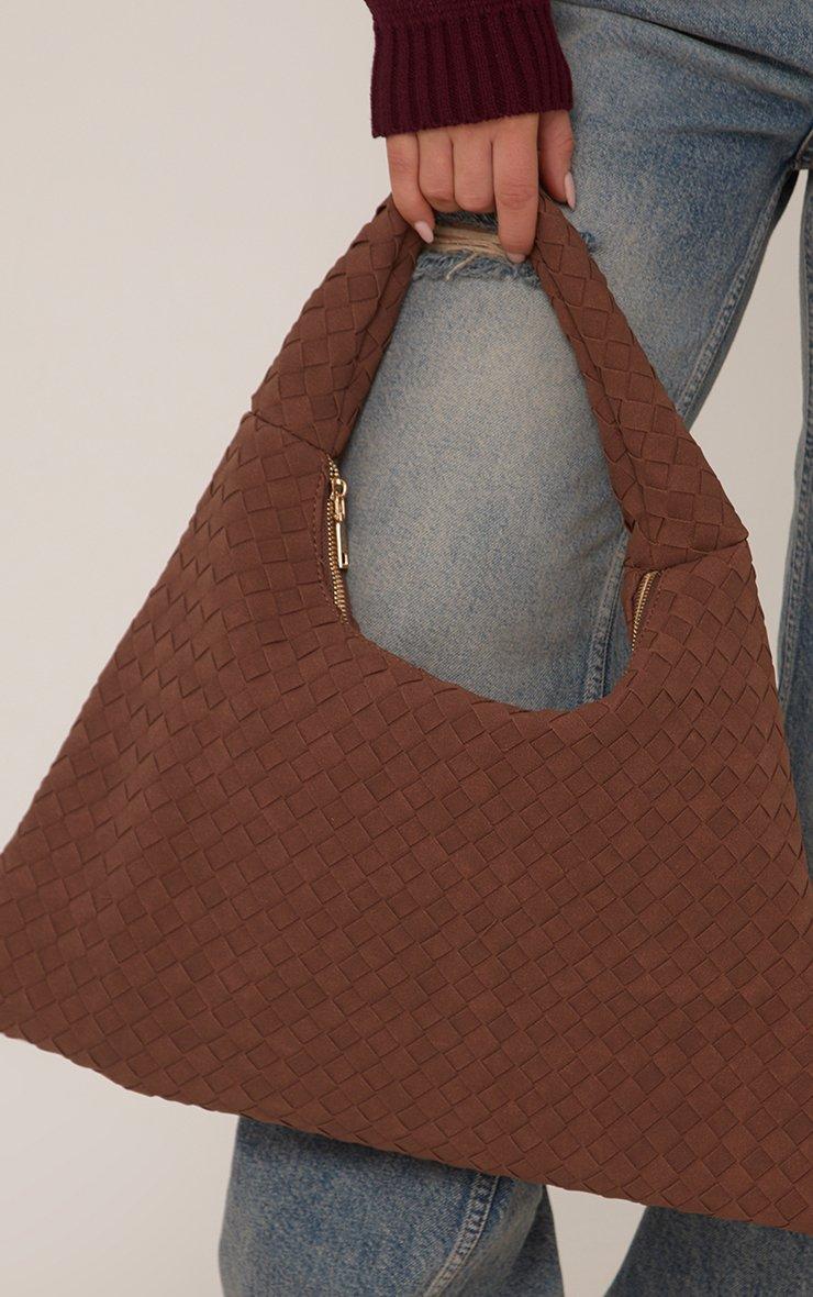 Doll, bring the chic vibes! Featuring a brown faux suede material with woven detailing, this shaped shoulder shopper bag is your new fave for effortless elegance.