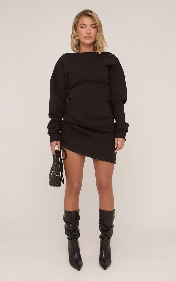 Oversized Long Sleeve Ruched Side Mini Sweat Dress In Black