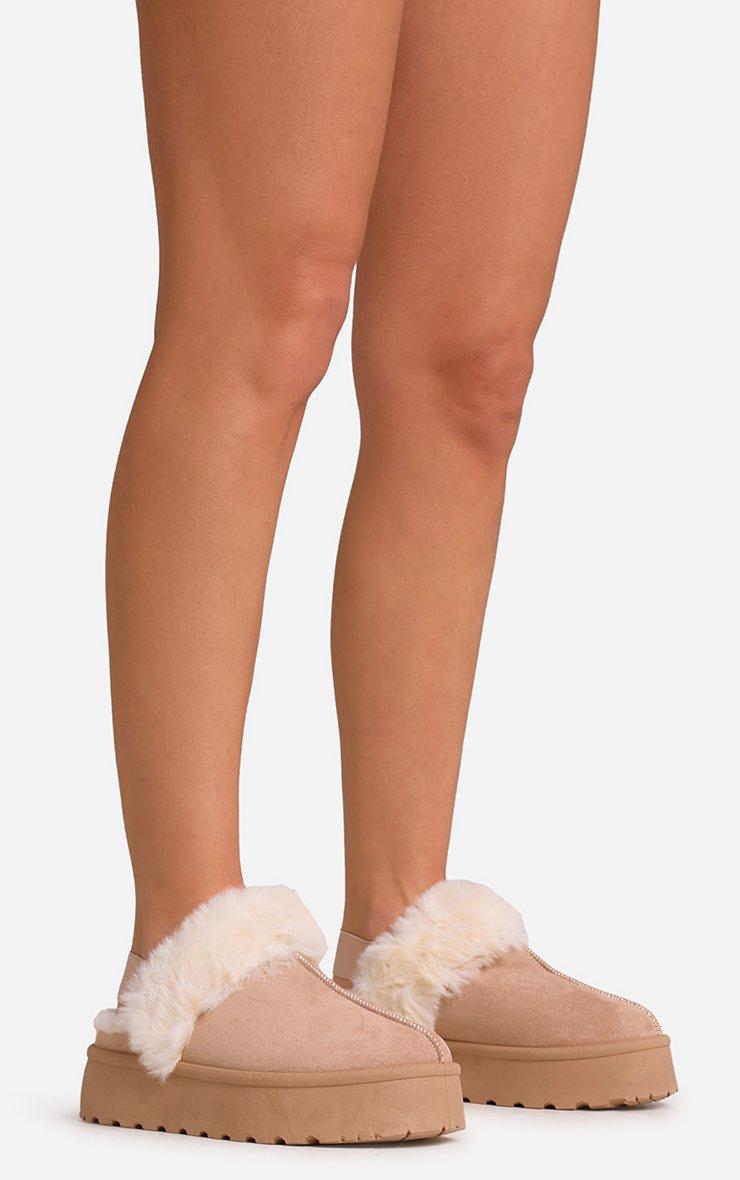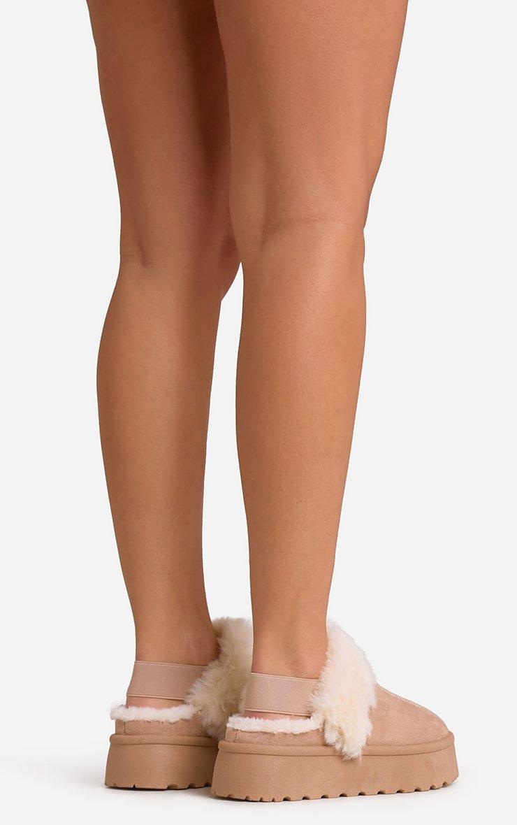 Zell Faux Fur Detail Slingback Platform Slipper In Beige Faux Suede