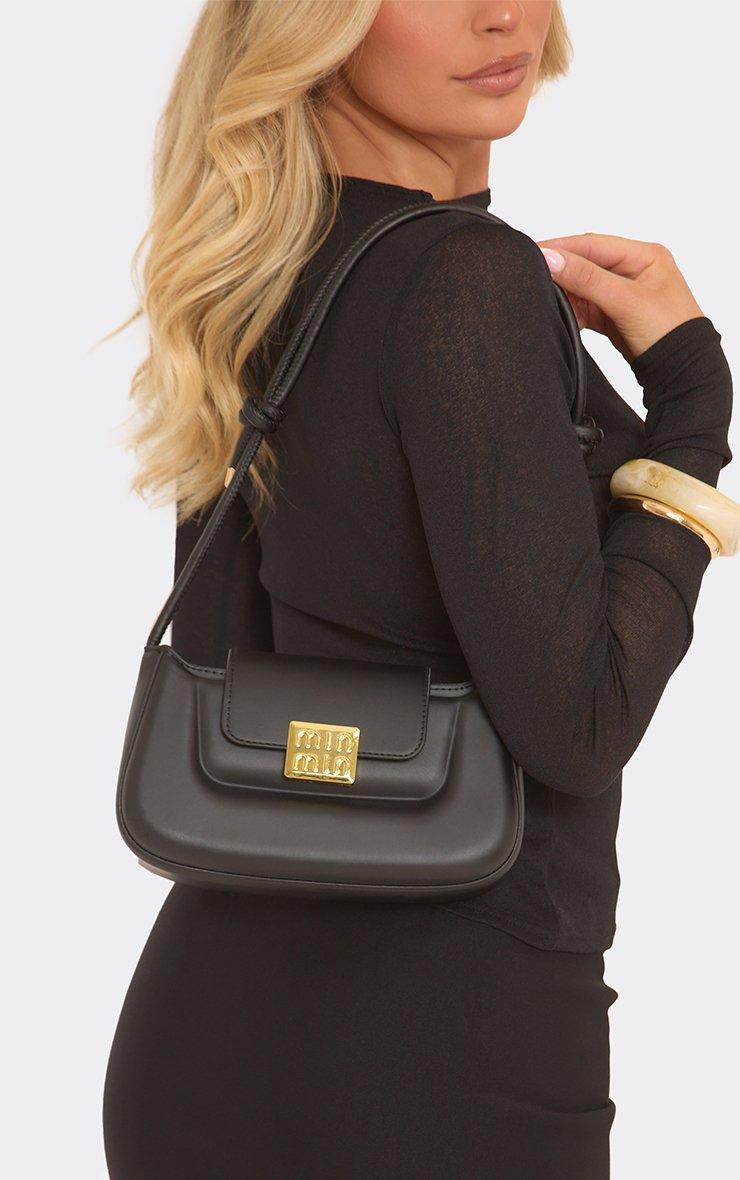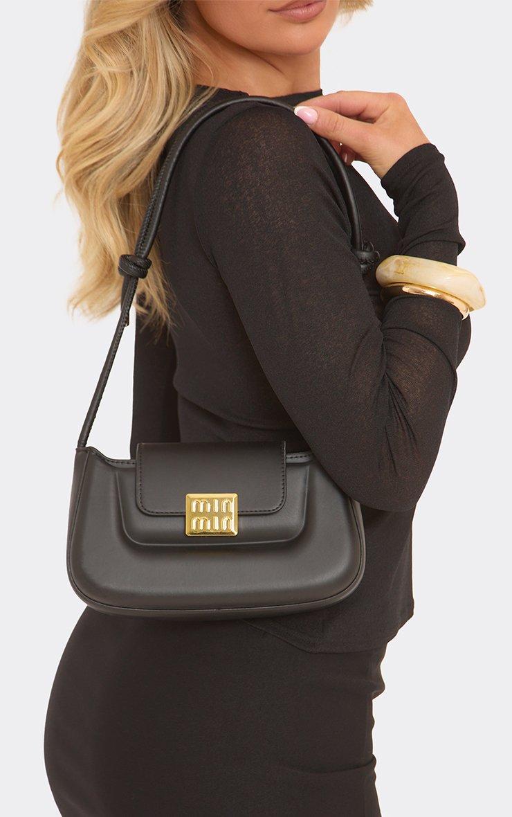 Sleek and statement-making, doll! Featuring black faux leather with bold logo detailing and a shaped silhouette, this shoulder bag is the ultimate go-to for elevating your everyday look with edge and style.