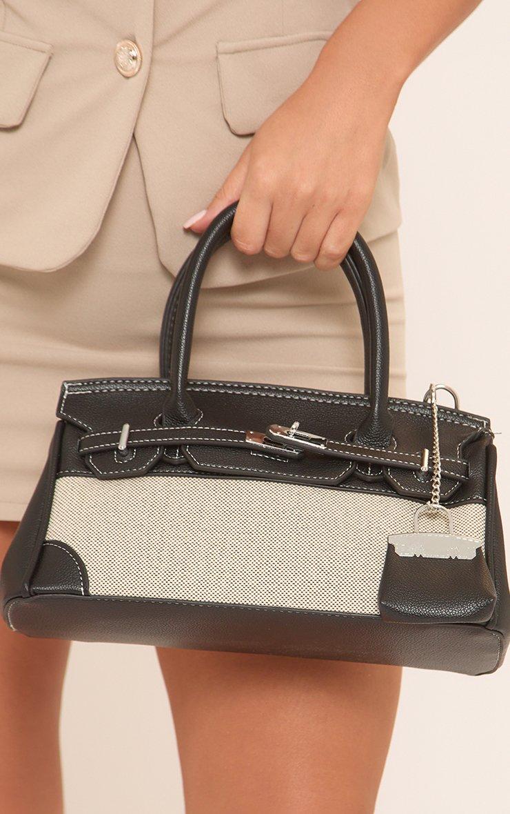 Eddy Lock Detail Contrast Woven Tote Bag In Black Faux Leather