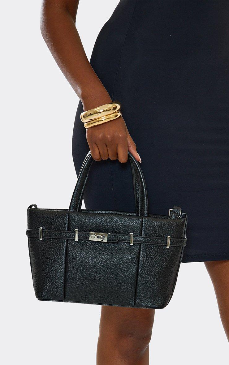 Maja Lock Detail Shaped Tote Bag In Black Textured Faux Leather
