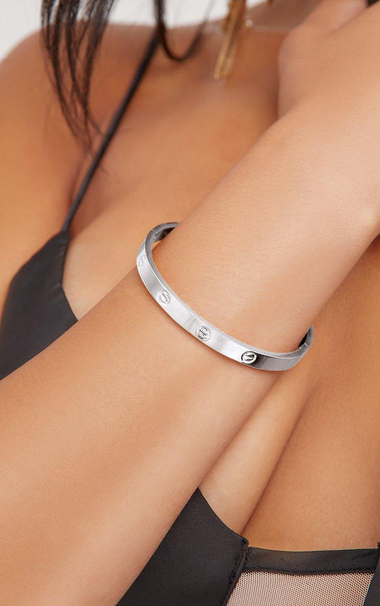 Elevate your date night look with this essential bracelet doll. Featuring a silver material, with engraved detailing and a bangle design.