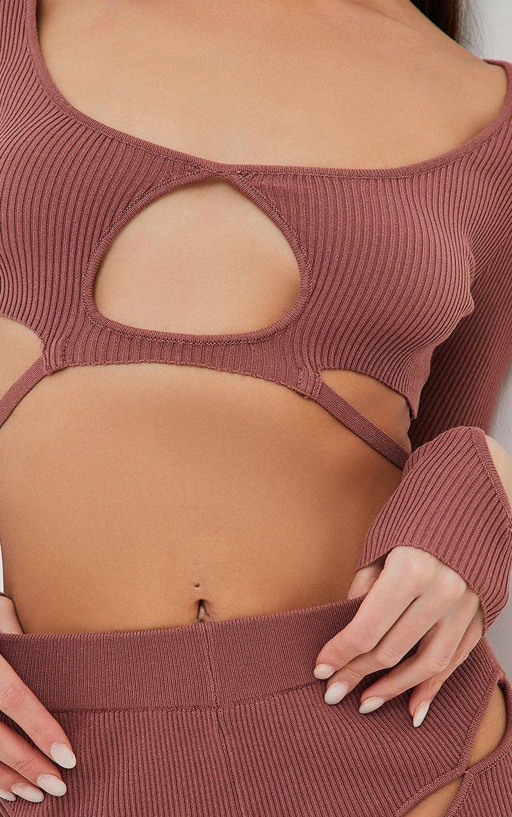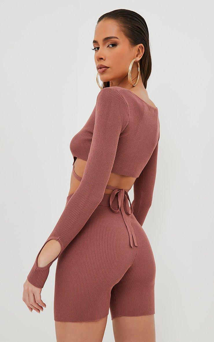 Long Sleeve Cut Out Tie Back Detail Crop Top In Mocha Ribbed Knit