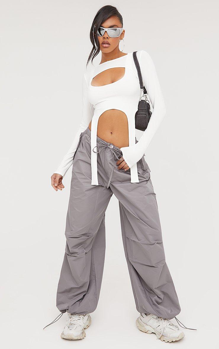 Long Sleeve Suspender Detail Double Layered Crop Top In Cream Slinky