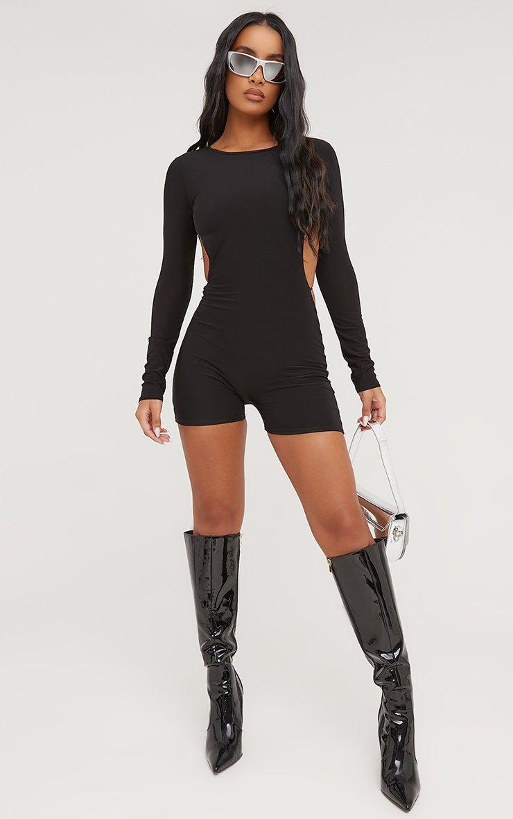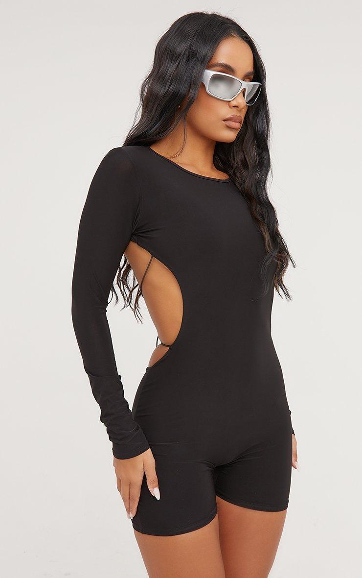 Long Sleeve Open Back Thong Detail Playsuit In Black Slinky