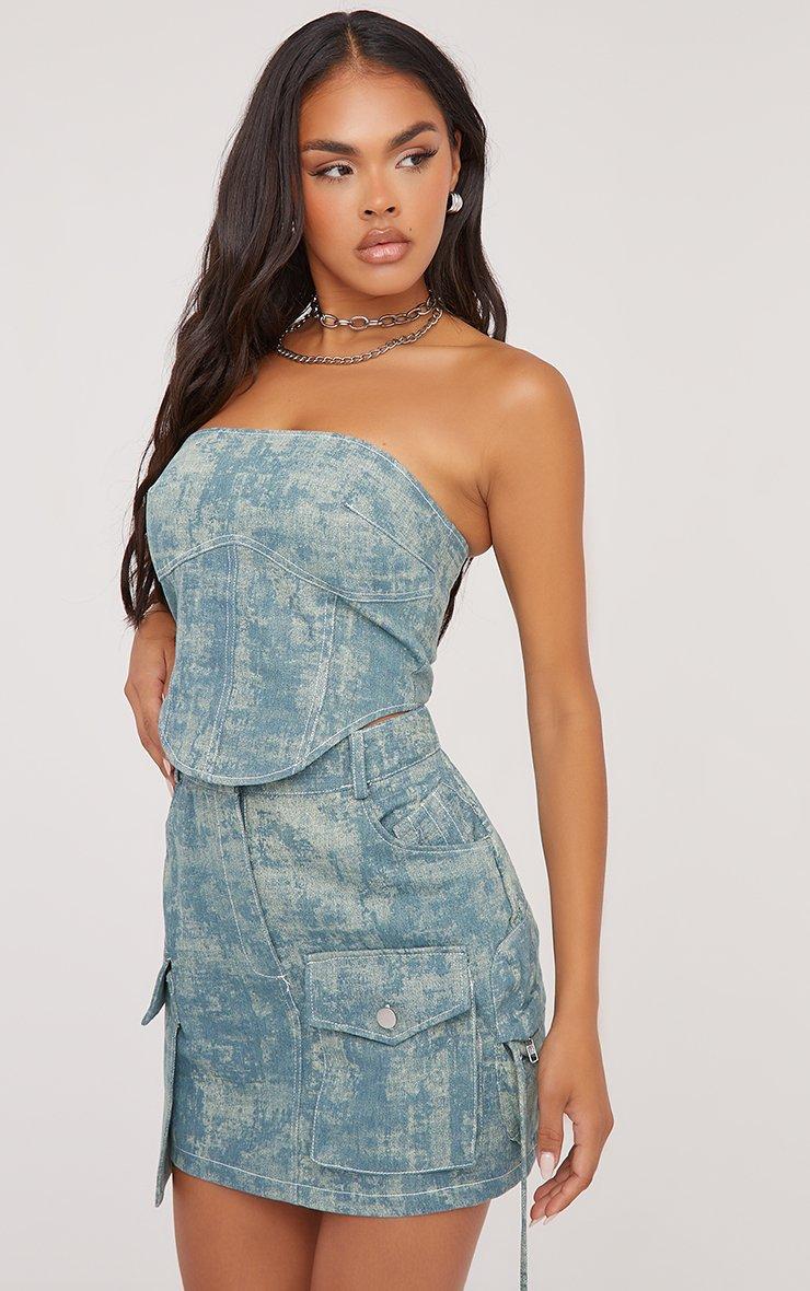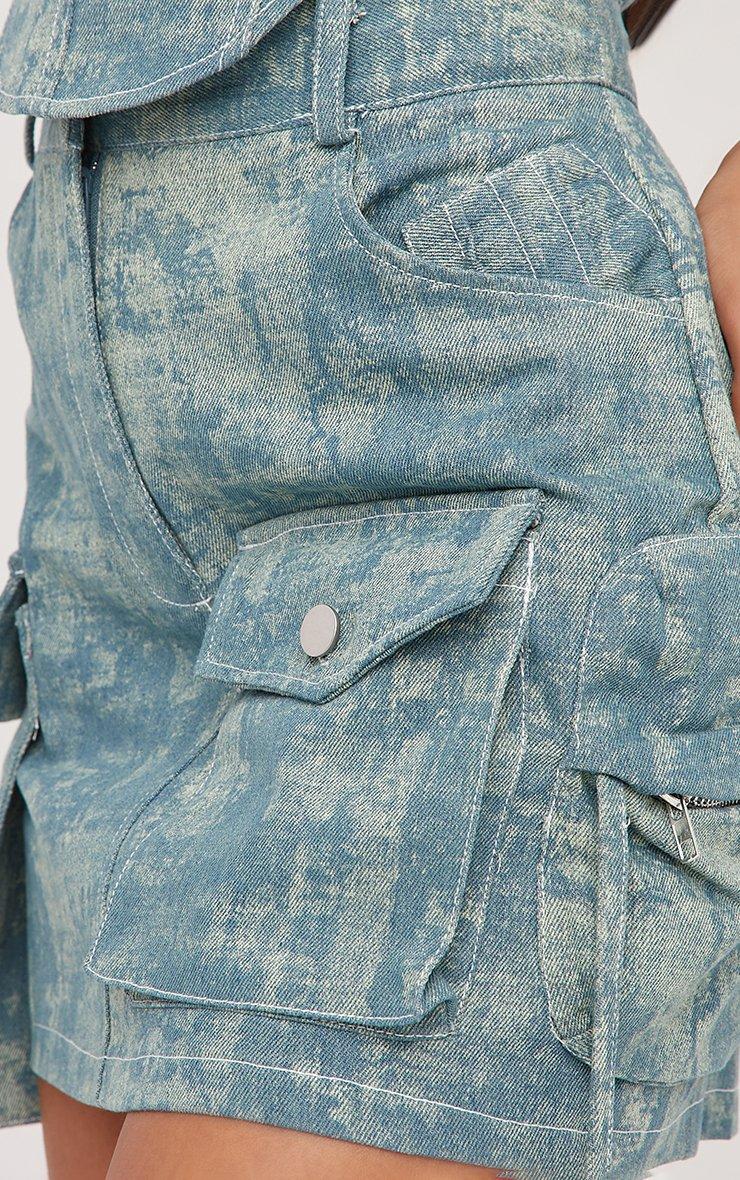 This skirt will steal all the stares doll. Featuring a washed blue denim material, a high waist, multi pocket detailing and a mini length.