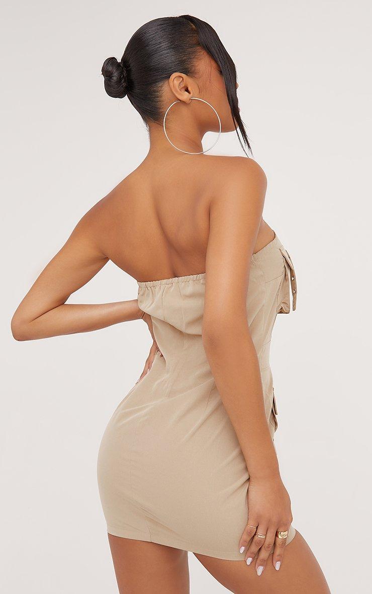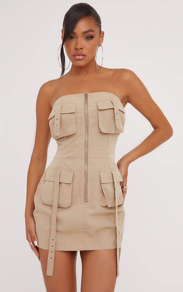 Get that model off duty look with this dress. Featuring a taupe material, a bandeau neckline, a zip front, multi pocket suspender detailing and a mini length.