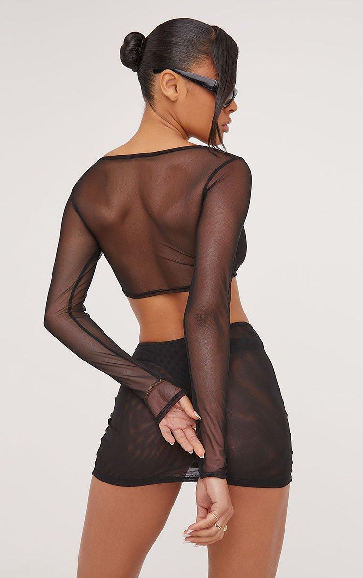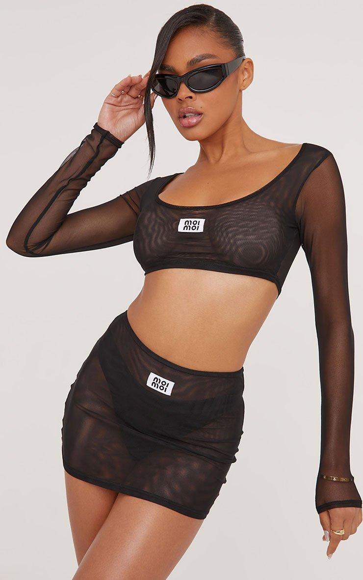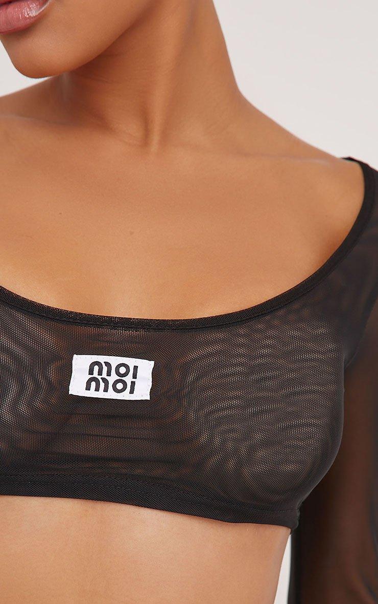 Say yes top this top doll. Featuring a black mesh material, long sleeves, a scoop neck, a Moi Moi badge print and a cropped length.