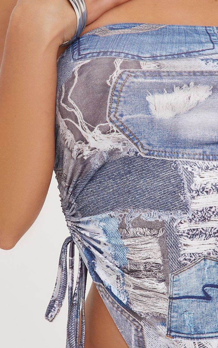 This must have print is sure to earn you some points this weekend doll. Featuring a blue denim print material, a bandeau neckline, ruched detailing and a bodysuit fit.