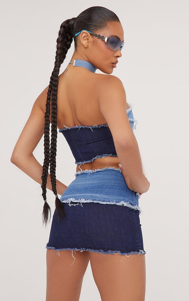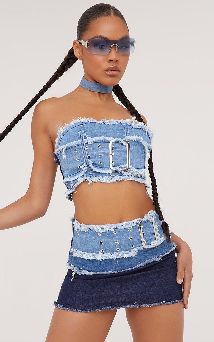 Bandeau Buckle Detail Frayed Contrast Crop Top In Blue Denim