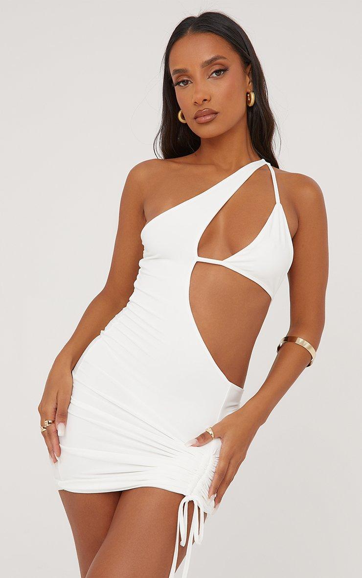 Girl, there's an all white party calling your name. Featuring a white material, with cut out ruched detailing, a one shoulder asymmetric detailing, mini length and a bodycon fit.