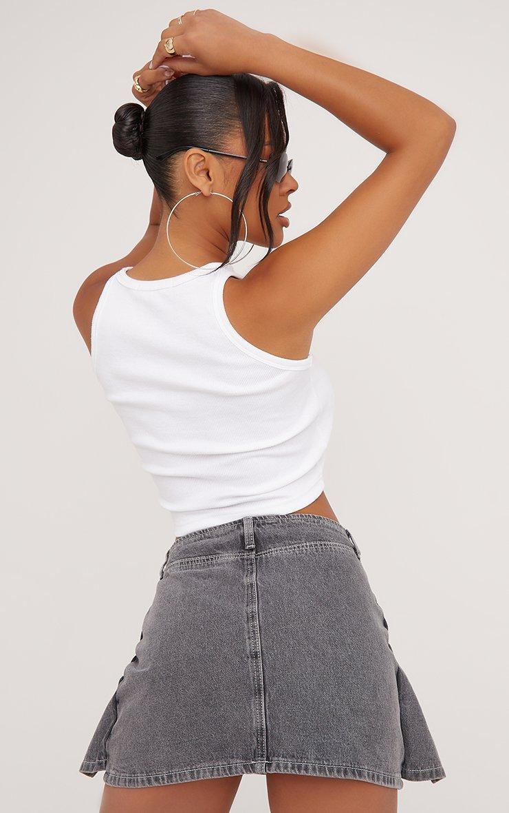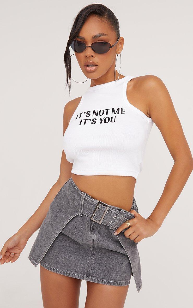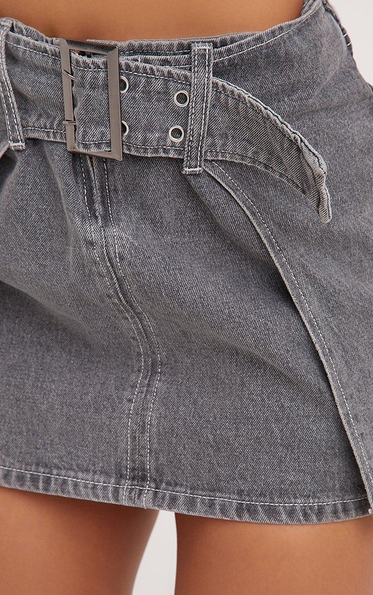 Get that 90s babe look with this skirt. Featuring a grey denim material, a low rise, a buckle belt detail and a mini length.