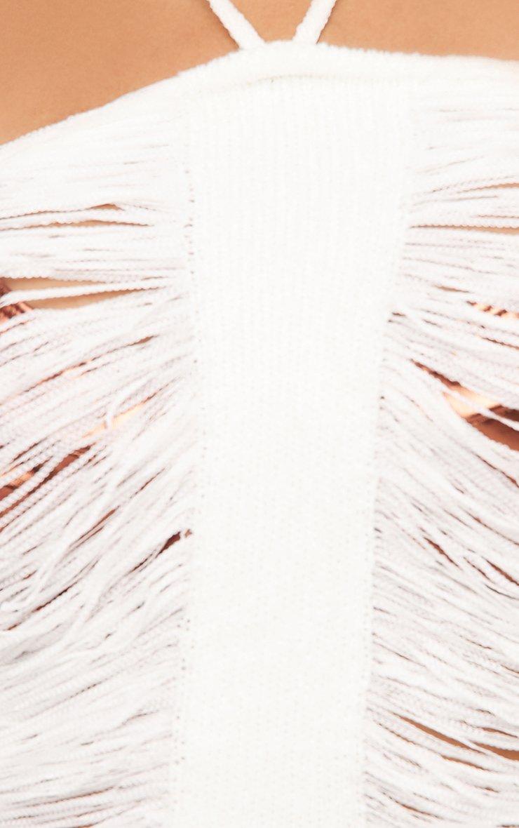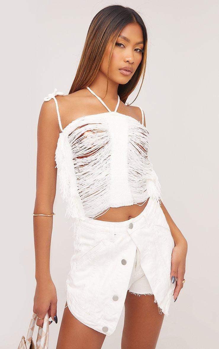 Halterneck Fringe Ladder Detail Crop Top In White Knit