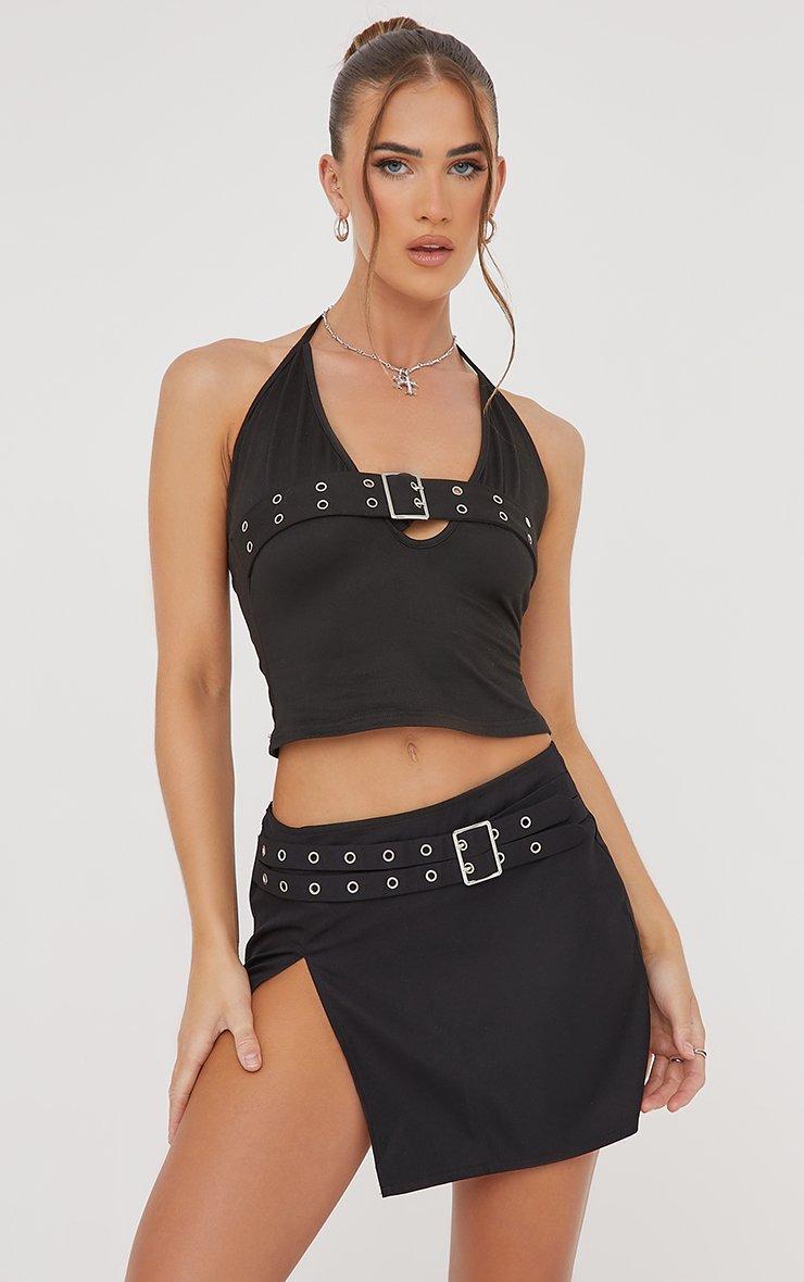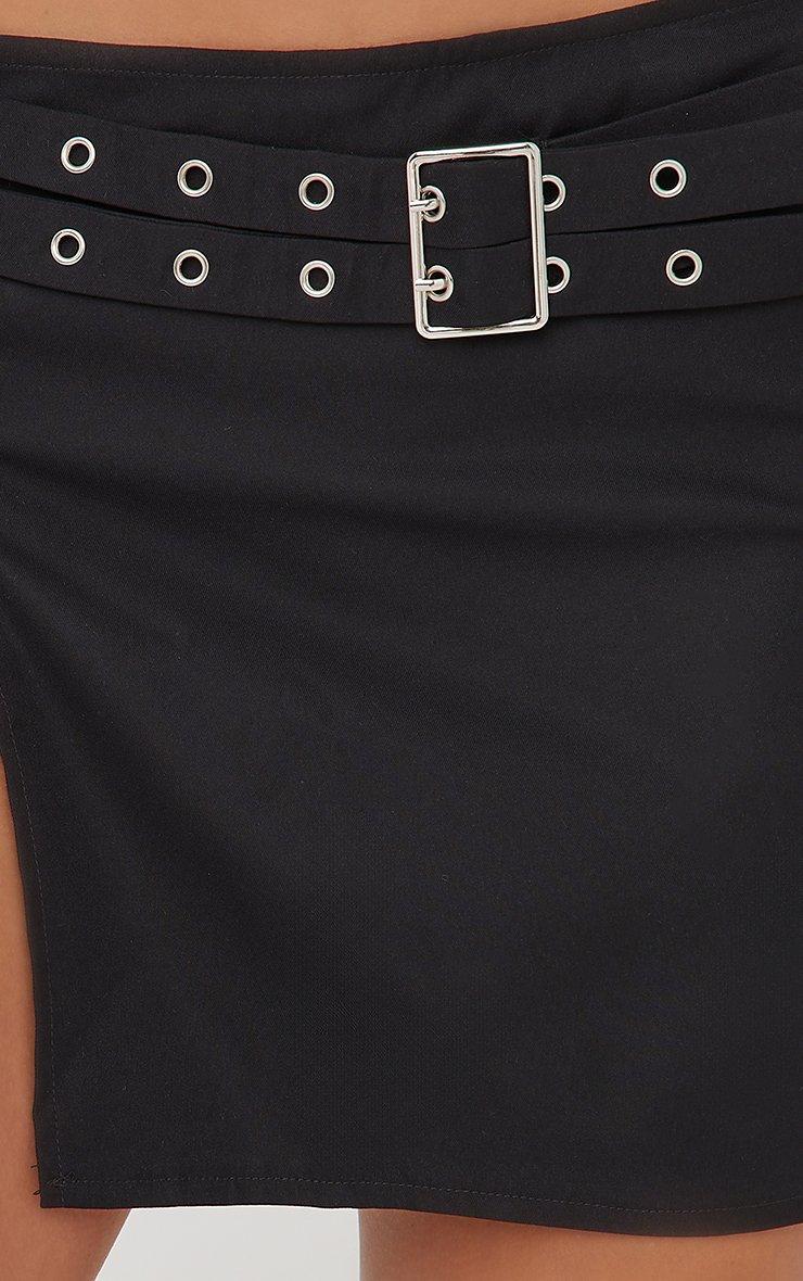This skirt is heading straight into our basket doll. Featuring a black material, a belted buckle detail, a split leg and a mini length.