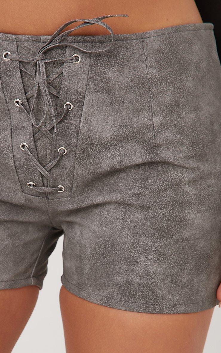 Lace Up Detail Hotpant Shorts In Grey Acid Wash Faux Leather