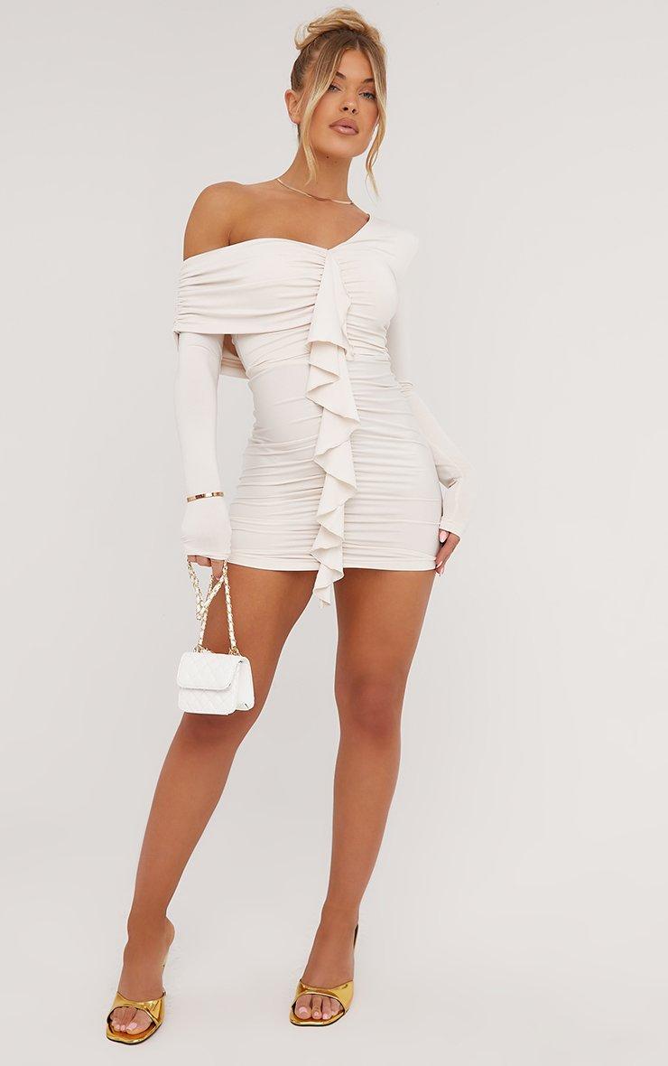 Off The Shoulder Frill Front Mini Bodycon Dress In Cream Slinky