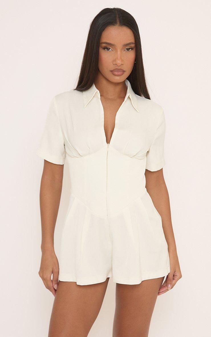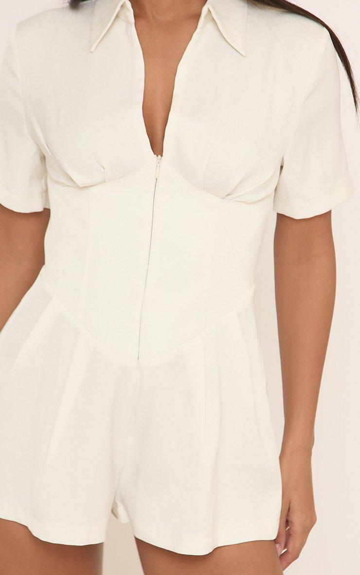 Weekend vibes, but make it chic, doll! Featuring white material with short sleeves, corset detailing, and a collared design, this playsuit brings bold structure and effortless elegance. Perfect for when you want to stand out!