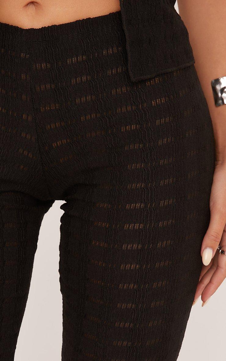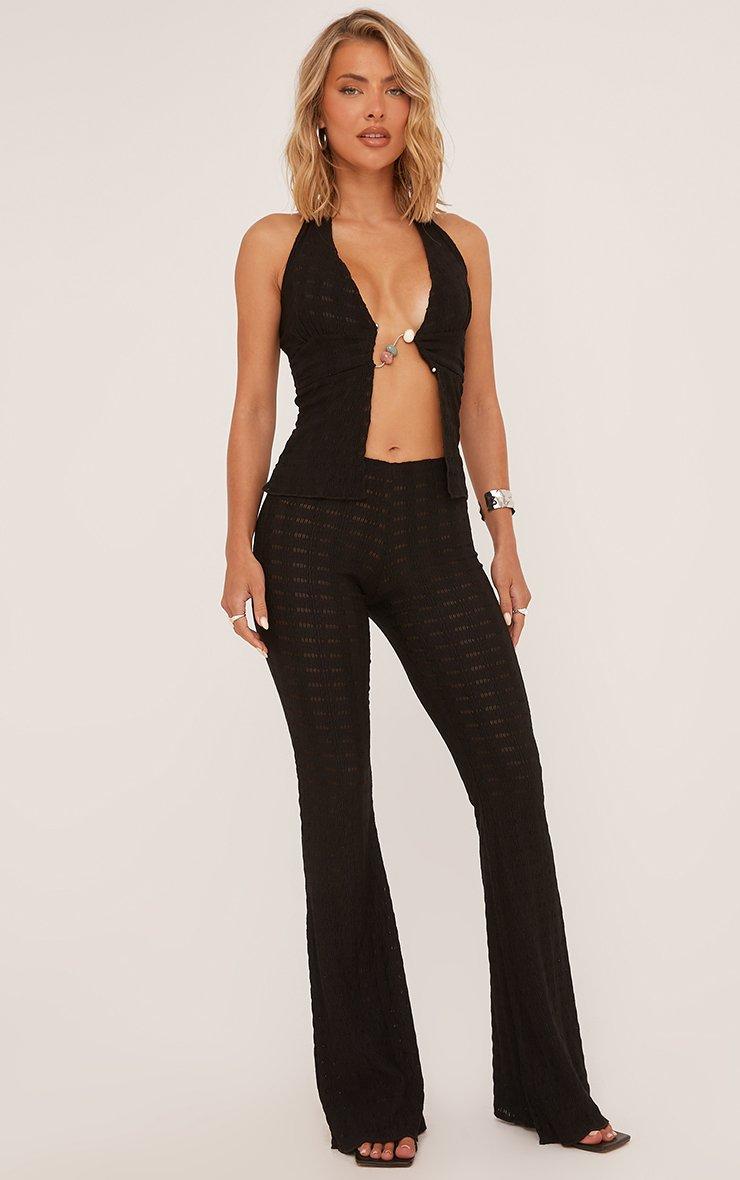 Trousers suited for any occasion. Featuring a black textured material, a mid rise fit and a flared leg design.