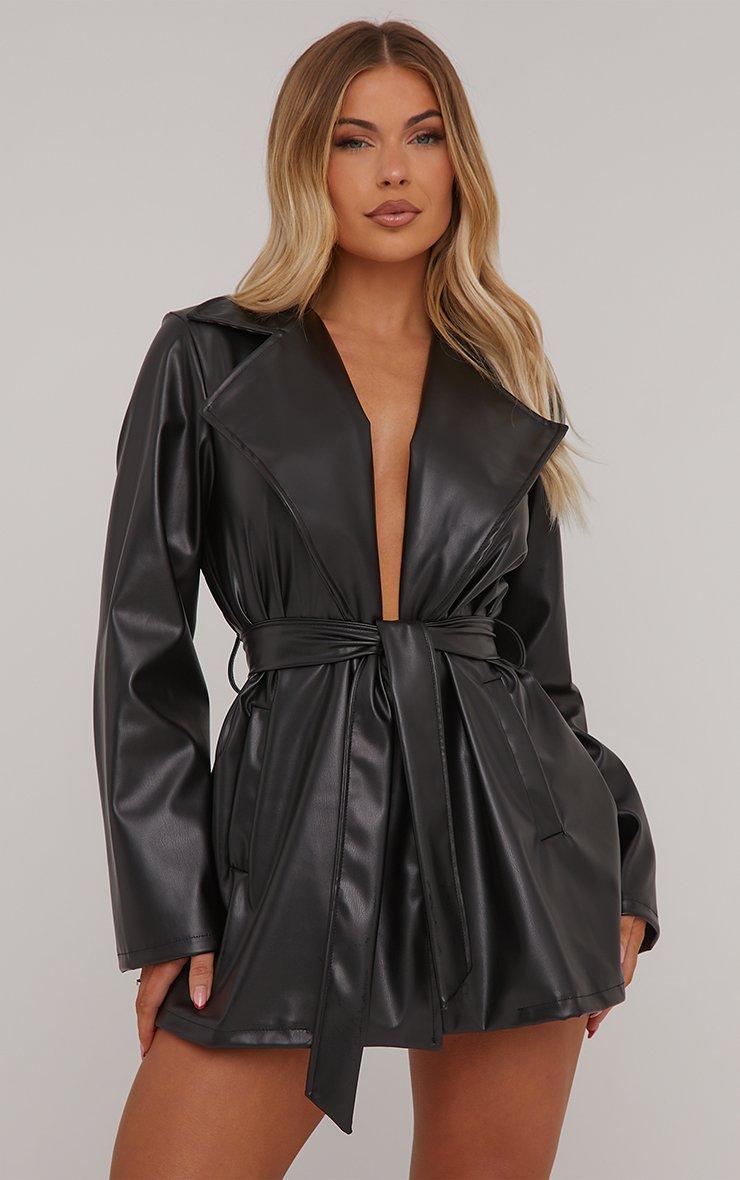 Tie Waist Detail Blazer Dress In Black Faux Leather