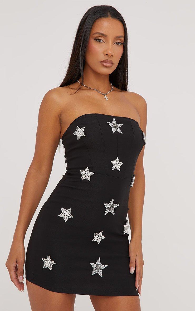 Be the centre of attention with this dress. Featuring a black material, a bandeau neckline, embellished star detailing and a mini length.