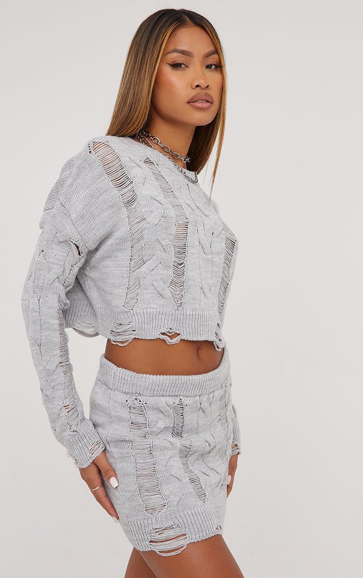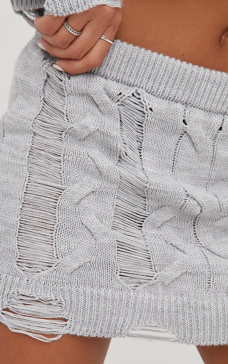 Freshen up your AW wardrobe with this skirt. Featuring a grey cable knit material, distressed detailing and a mini length.
