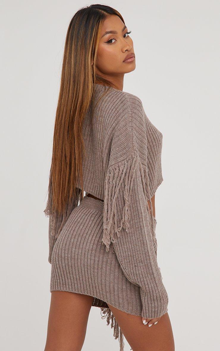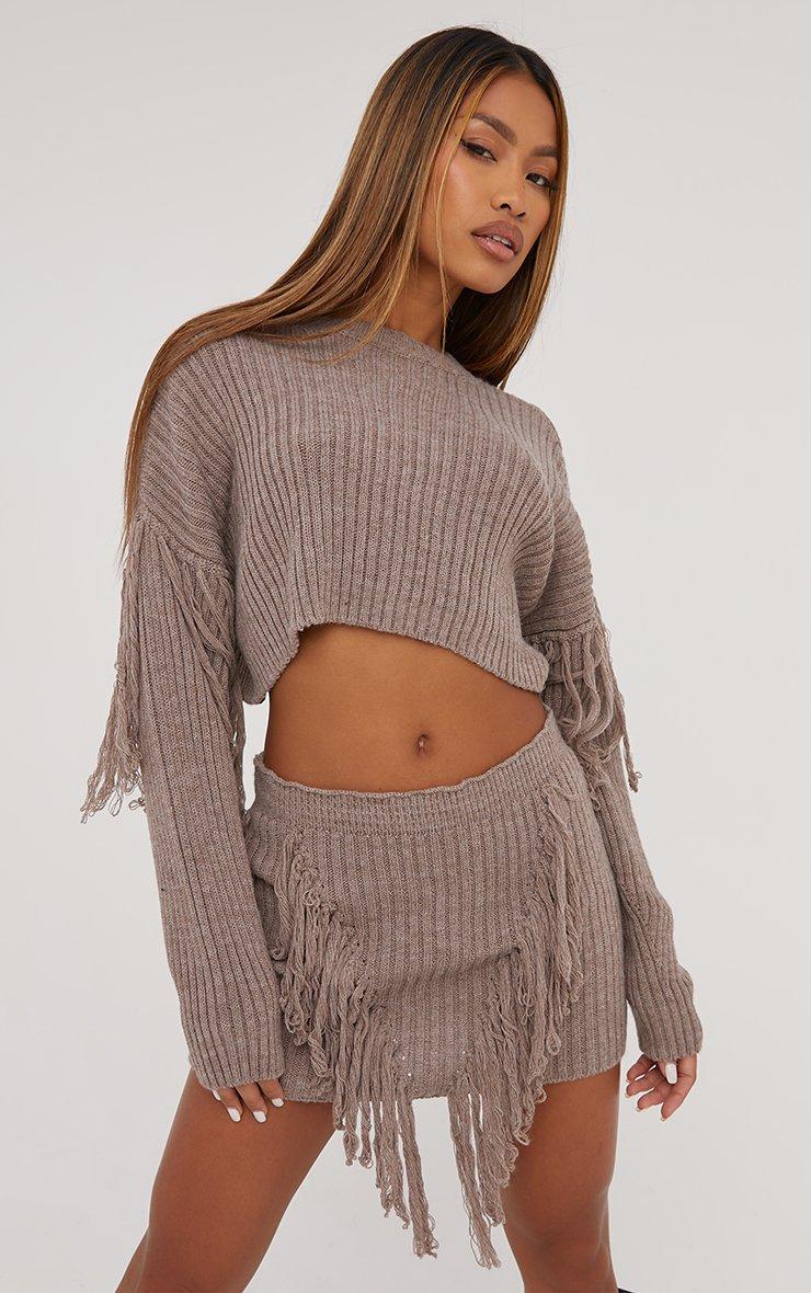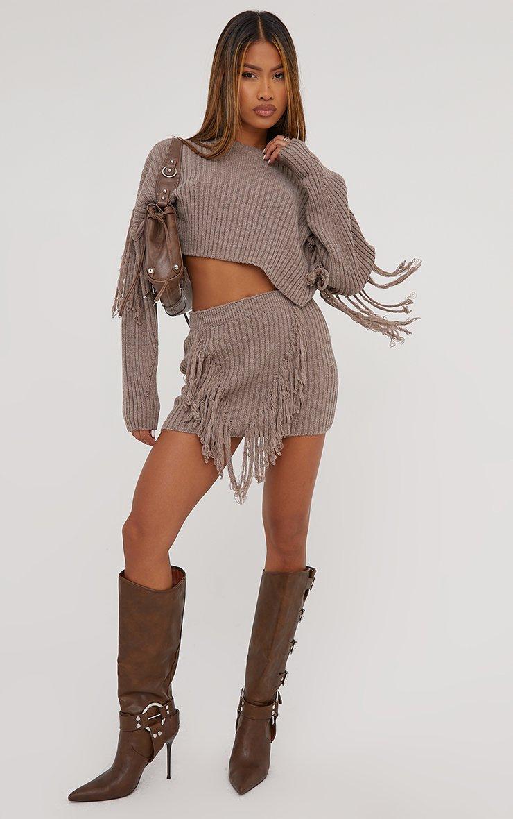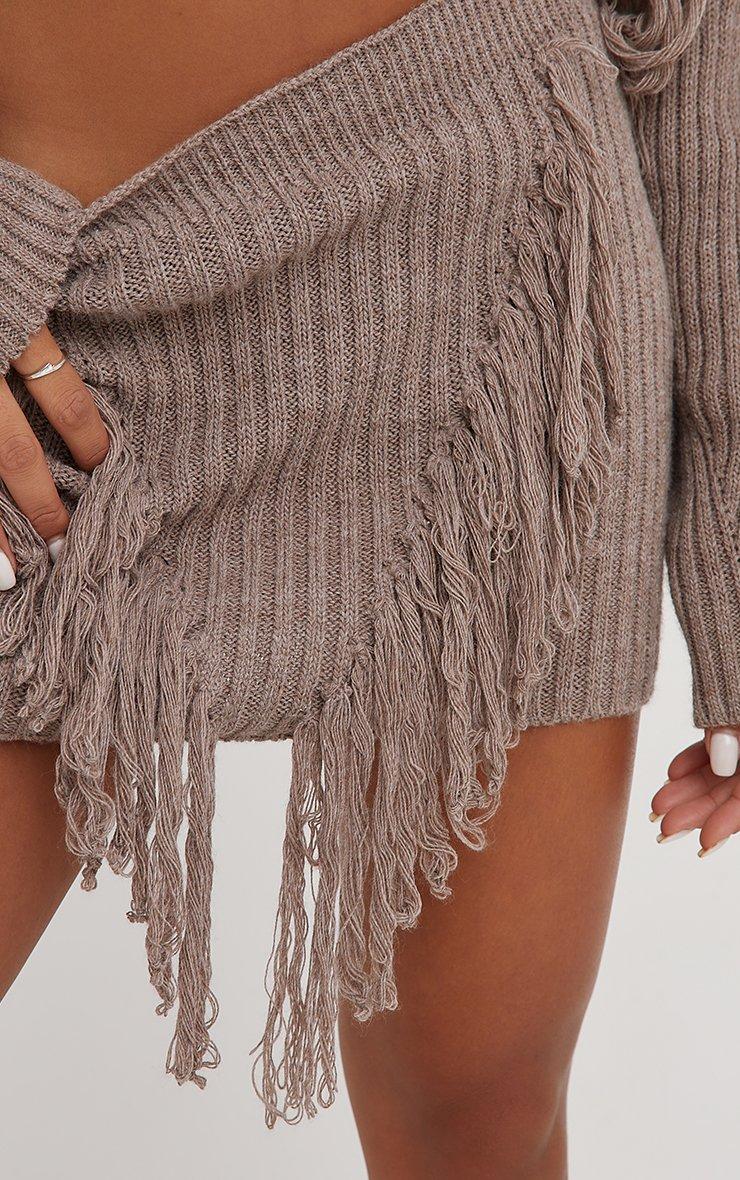 Fringe Detail Mini Skirt In Mocha Brown Knit
