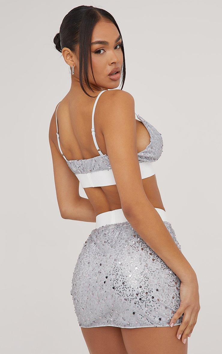 Take your party look from 0-100 with this bralet girl. Featuring a silver sequin material, thin straps, a plunge neckline and a cropped length.