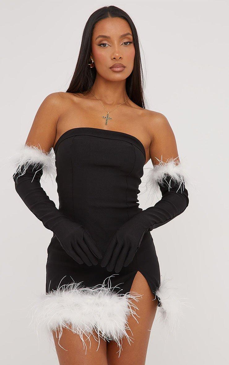Girl, be the best dressed this party season with this dress. Featuring a black material, a bandeau neckline, contrast faux feather detail, gloves and a mini length.
