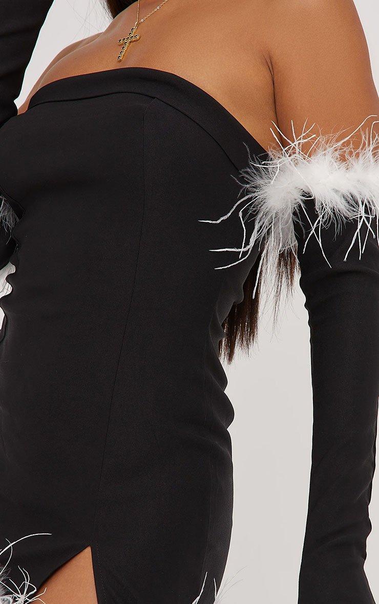Bandeau Contrast Faux Feather Trim Detail Split Leg Mini Bodycon Dress With Gloves In Black