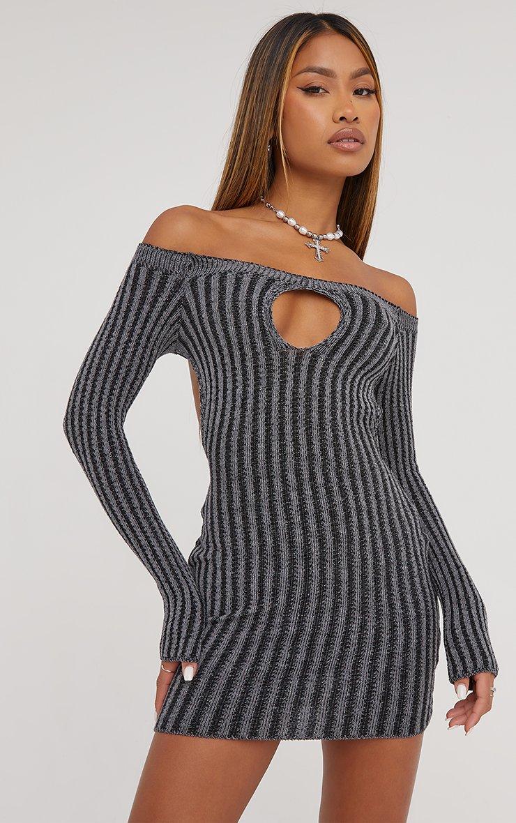 Bardot Keyhole Cut Out Detail Open Back Contrast Mini Bodycon Dress In Grey Knit