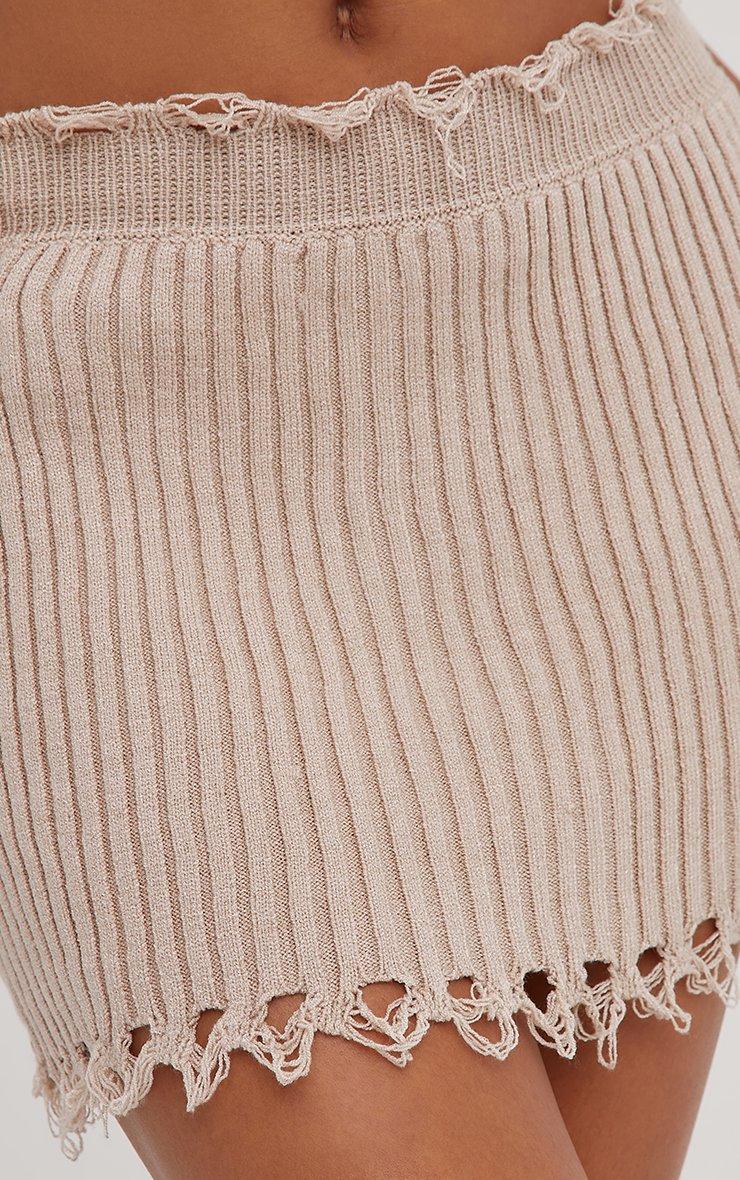 Bandeau Distressed Detail Crop Top And High Waist Mini Bodycon Skirt Co-Ord Set In Beige Knit