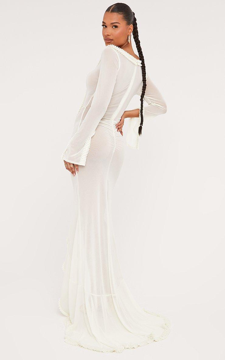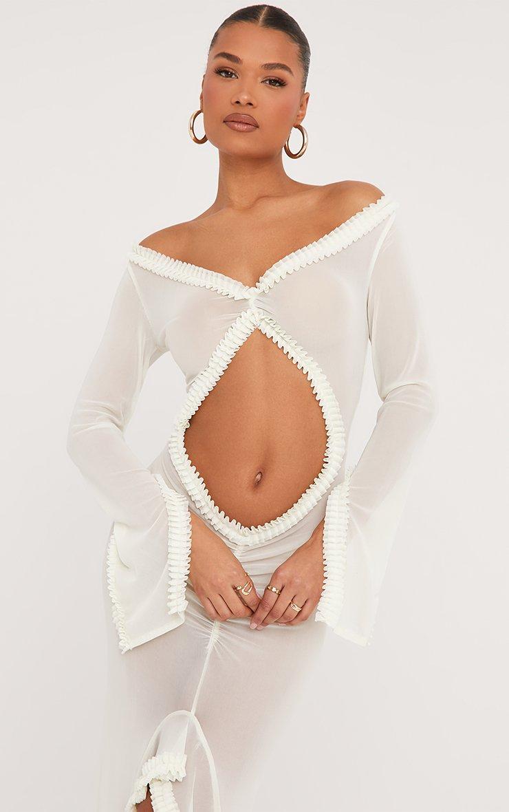 Plunge Long Sleeve Frill Detail Cut Out Front Maxi Dress In Cream Mesh